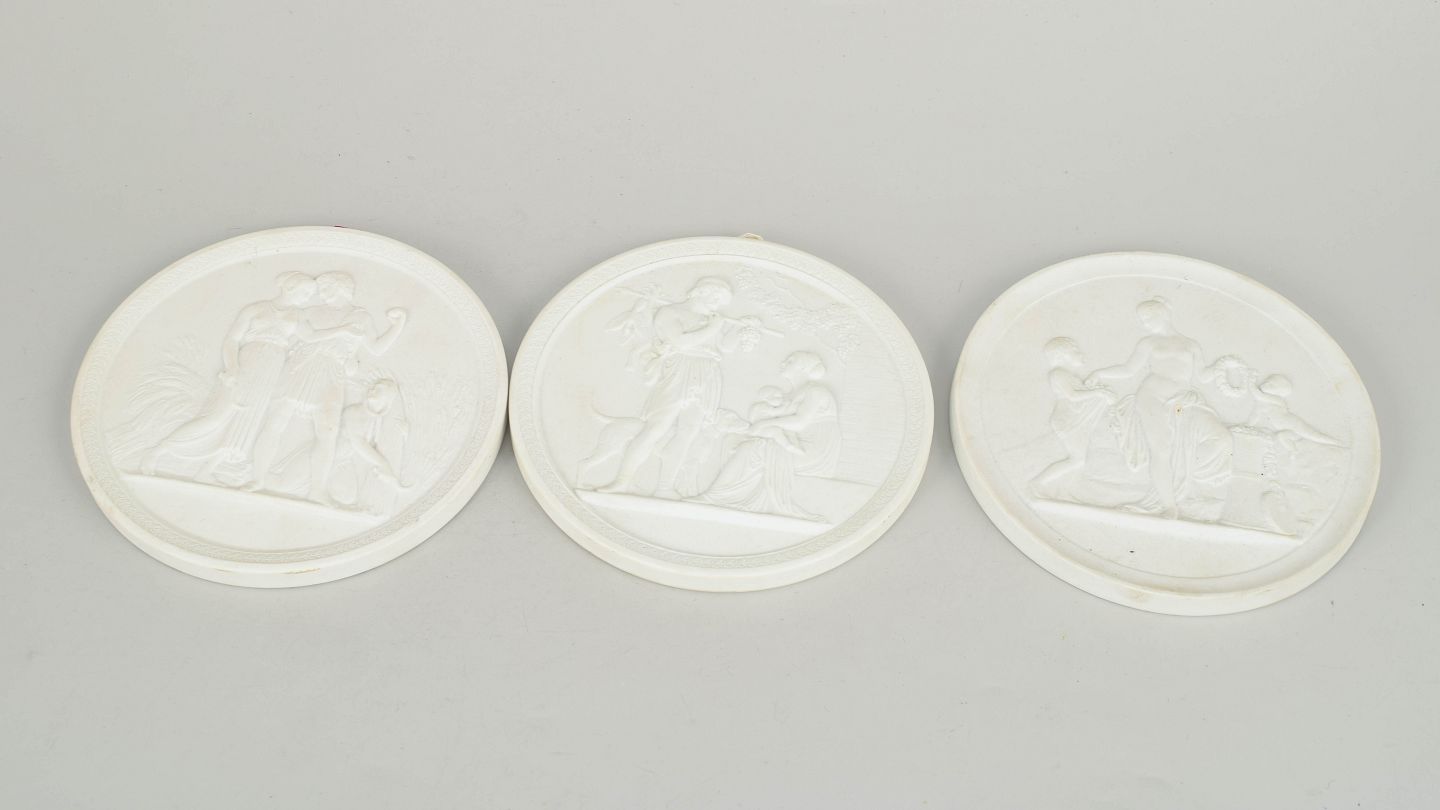 Royal Copenhagen, sæt af tre biscuit vægrelieffer efter Thorvaldsen.