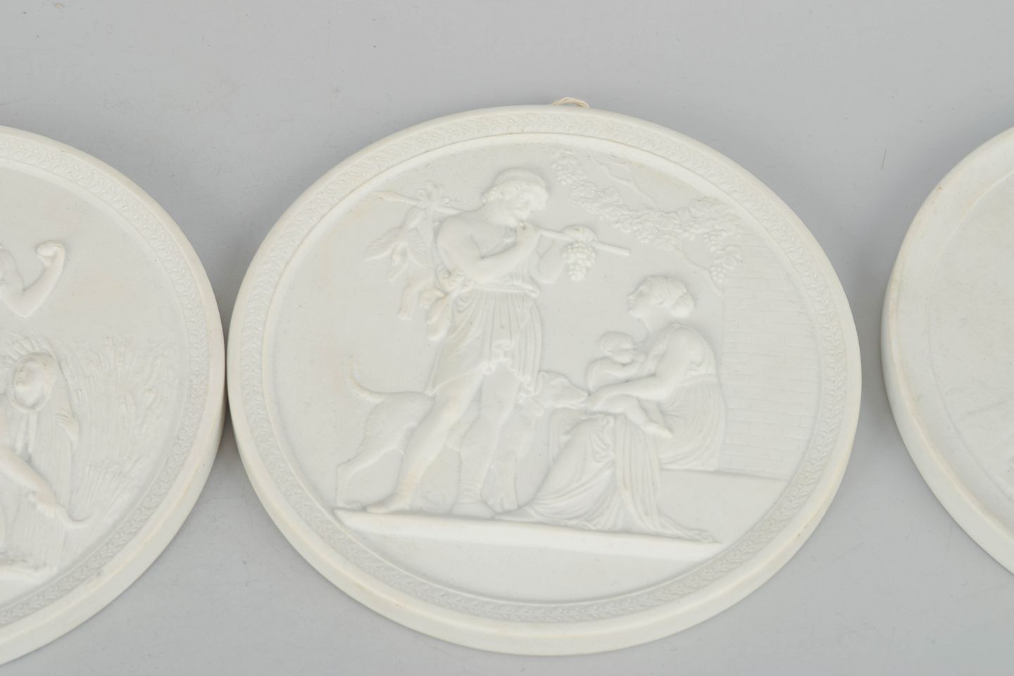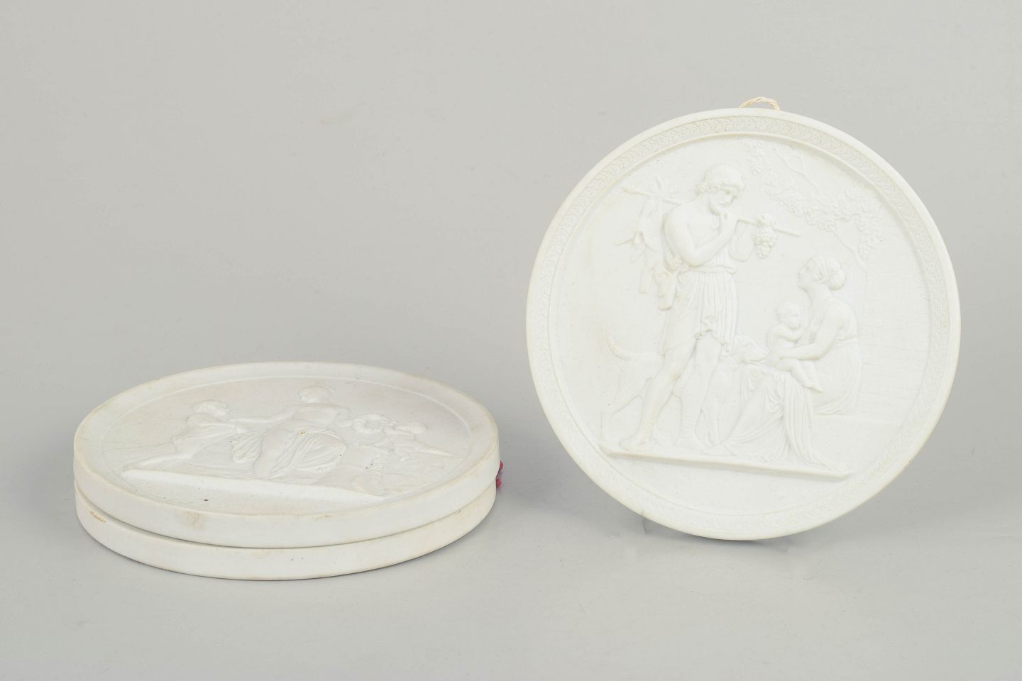 Relieffer i hvidt uglaseret porcelæn med klassiske motiver efter Bertel Thorvaldsen, udført i fin biscuit med detaljeret figurdekoration og ophæng på bagsiden.