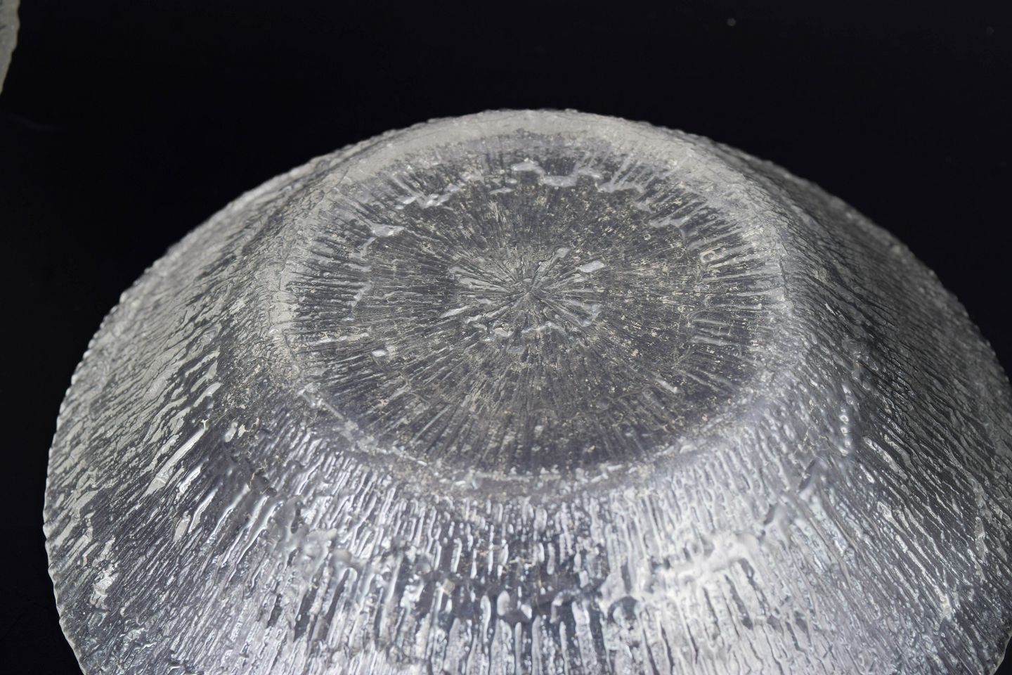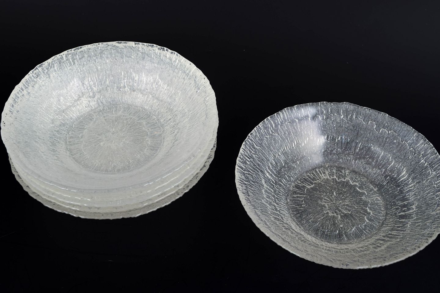 Elegant sæt af seks skåle i presset glas med karakteristisk organisk struktur og cirkulært reliefmønster. Designet fremhæver lysets spil i glasset og er et klassisk eksempel på finsk glasdesign fra perioden. Model Hopla i klart glas.