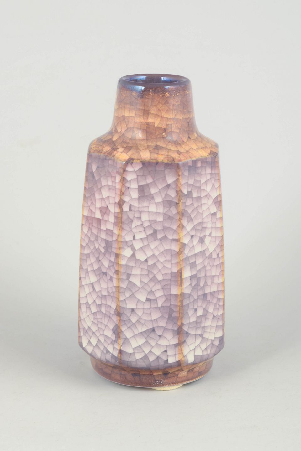 Dekorativ vase i stentøj med rillet overflade og lys glasur i creme og rosa nuancer. Formen er høj og let facetteret med en håndværksmæssig struktur, typisk for Marianne Starcks arbejde hos Michael Andersen & Søn. Stemplet i bunden.