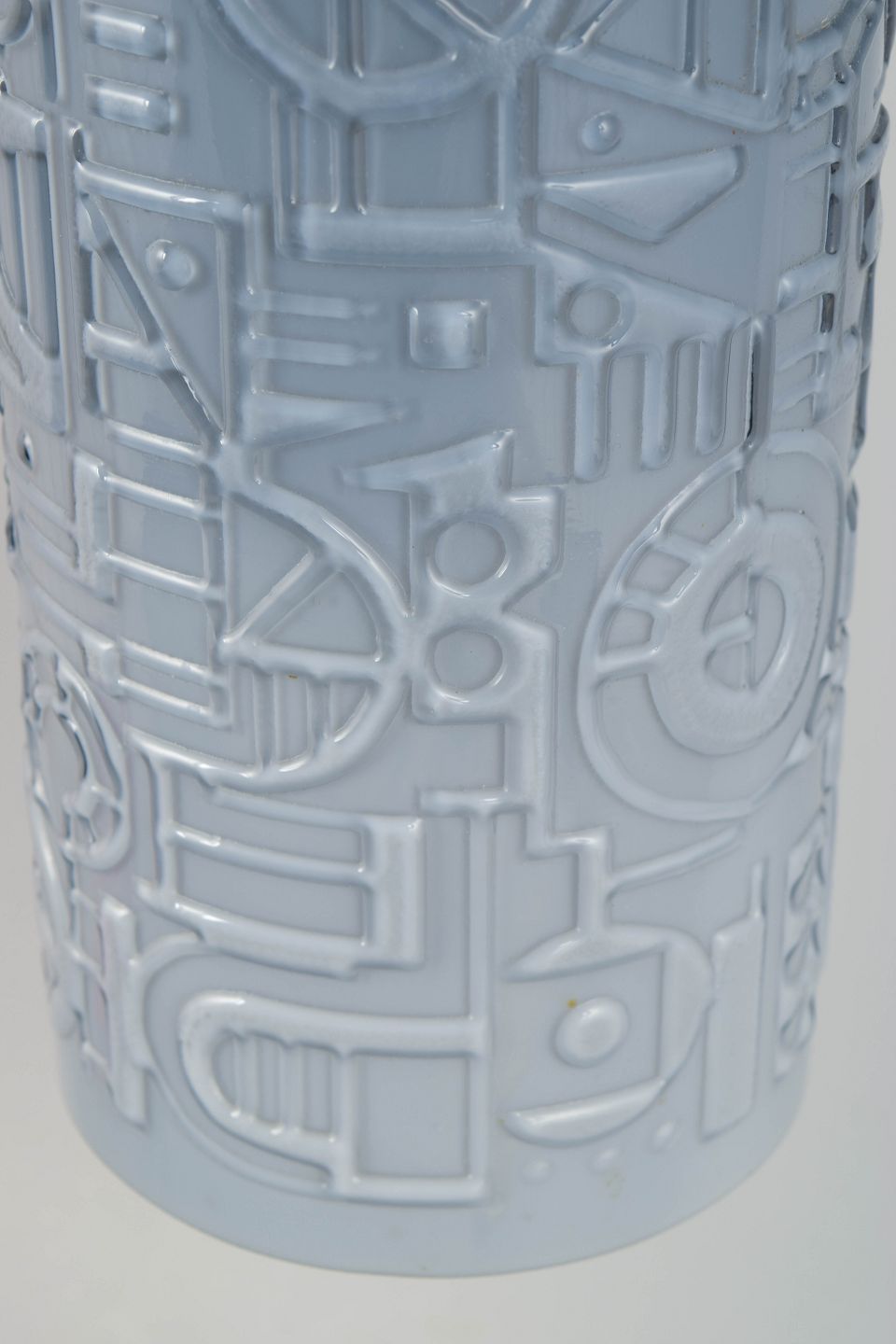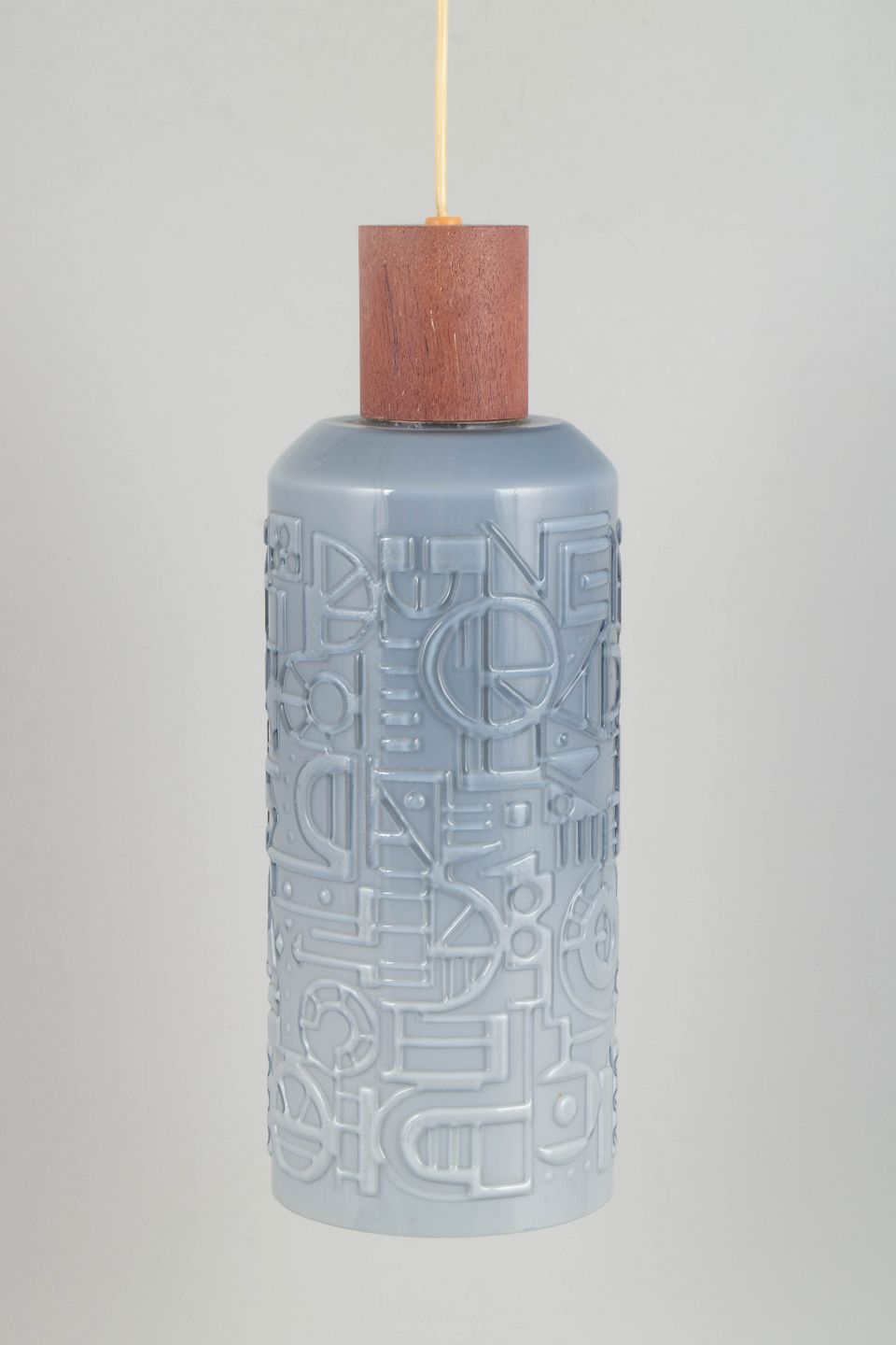 Cylinderformet loftlampe i støbt glas med reliefdekoration i geometrisk mønster. Udført i dæmpet gråblå nuance med ophæng i træ og original ledning.