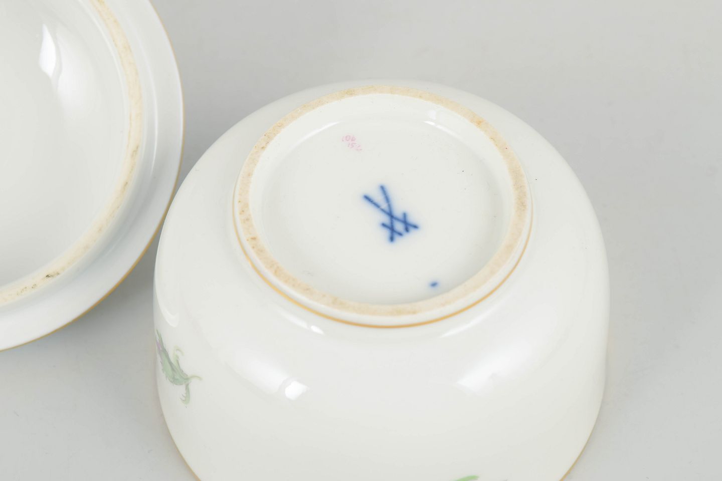 Meissen, sukkerskål med låg og polykrom blomsterdekoration.