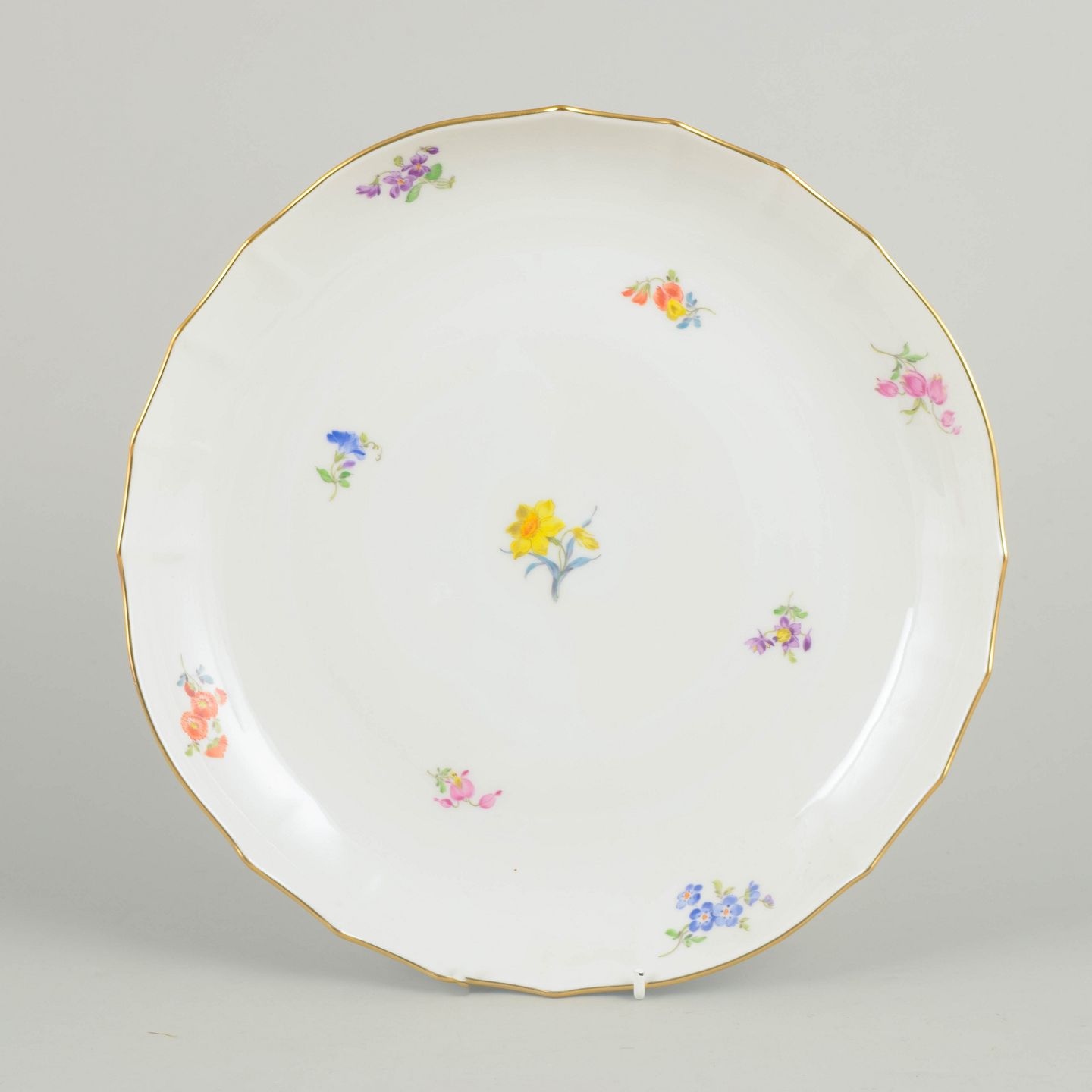 Stort rundt porcelænsfad håndmalet med spredte polykrome blomster og guldkant. Klassisk Meissen dekoration fra midten af det 20. århundrede, udført i fin kvalitet med let bølget rand. Undersiden mærket med Meissen krydssværd.