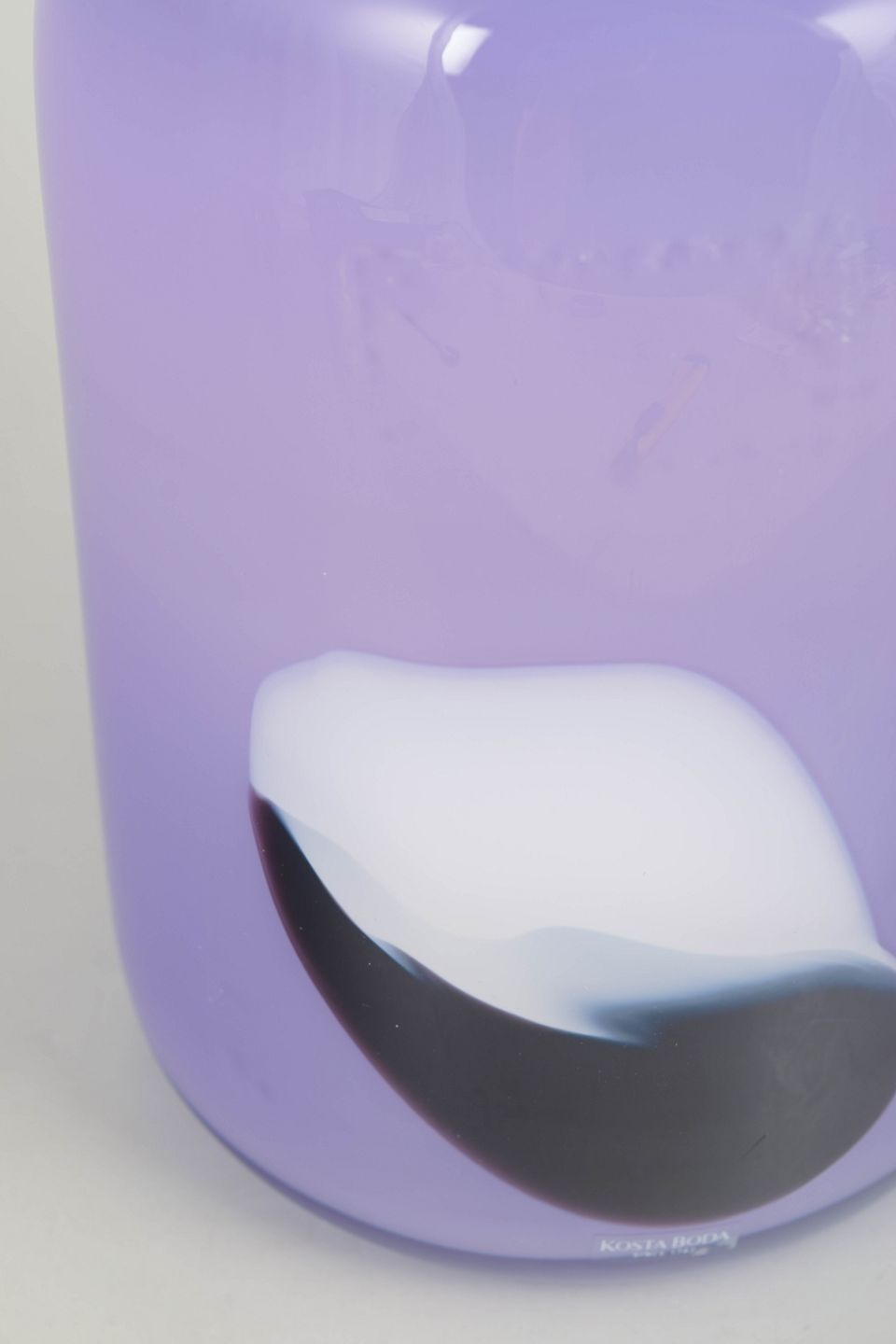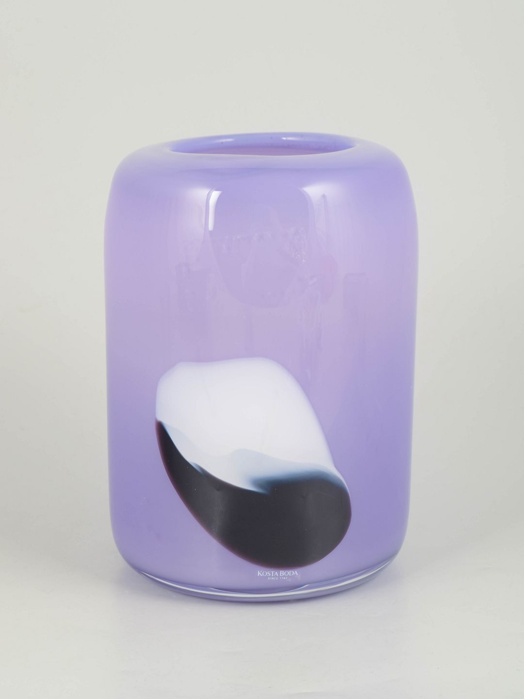 Cylindrisk kunstglasvase med blød lilla tone og indkapslet organisk form i hvid og sort. Mundblæst glas med skulpturel karakter, model 40226, signeret.