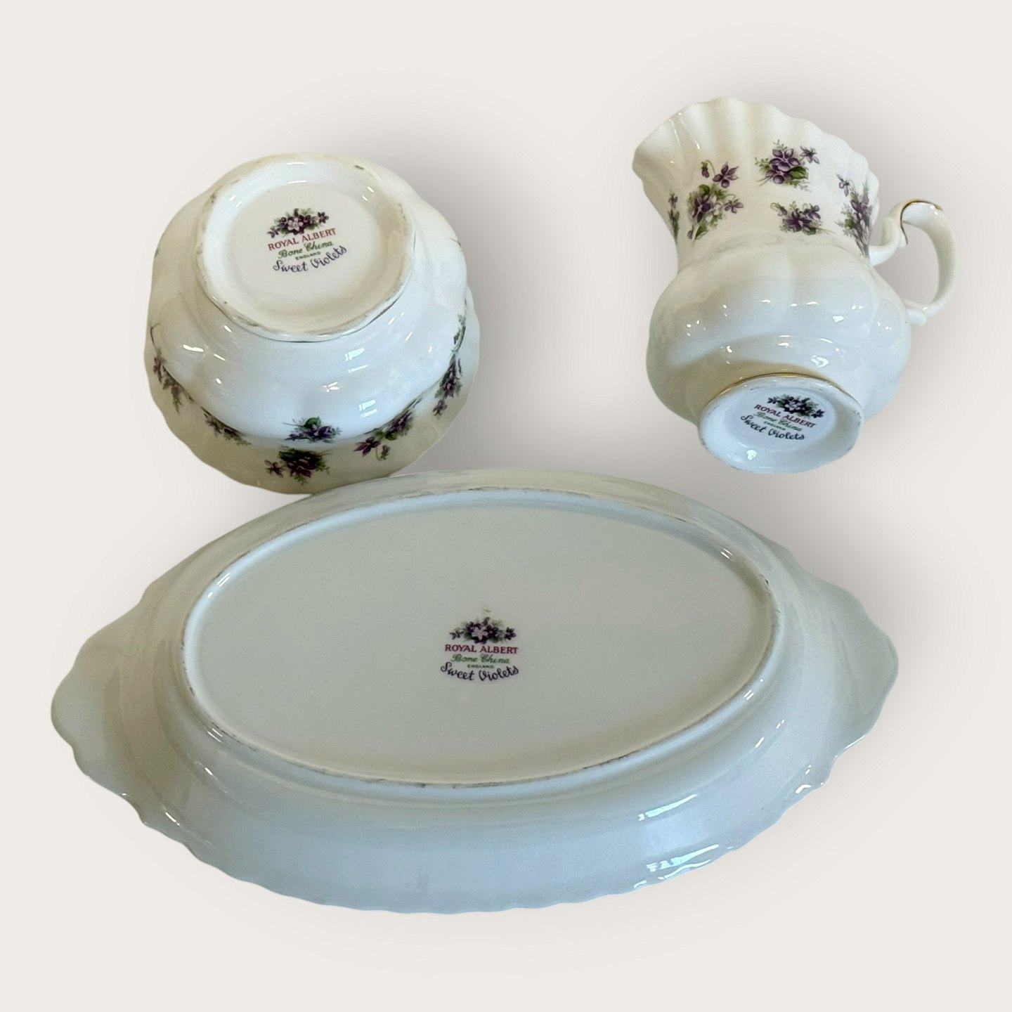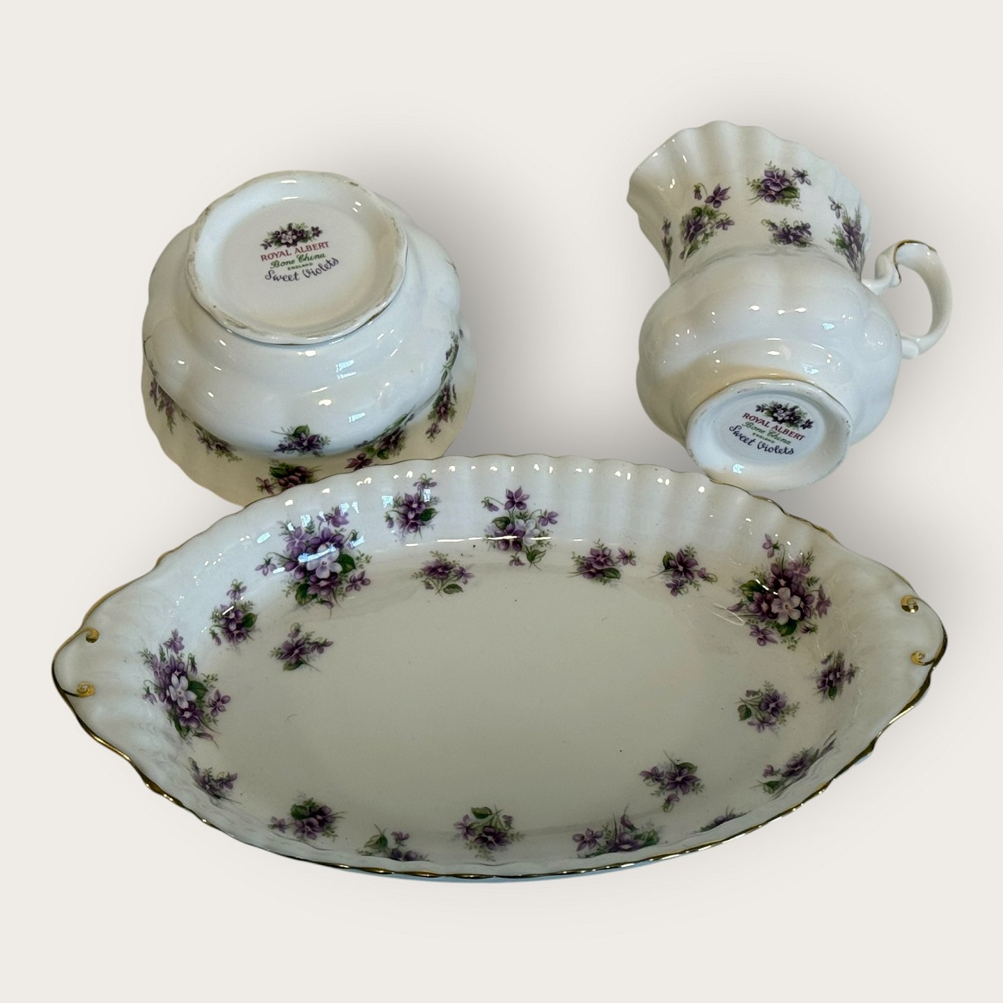 Royal Albert, Bone China, Sweet violets, Mark viol, Sukker, flødesæt på lille bakke, bakken måler 22x13cm *Perfekt stand*