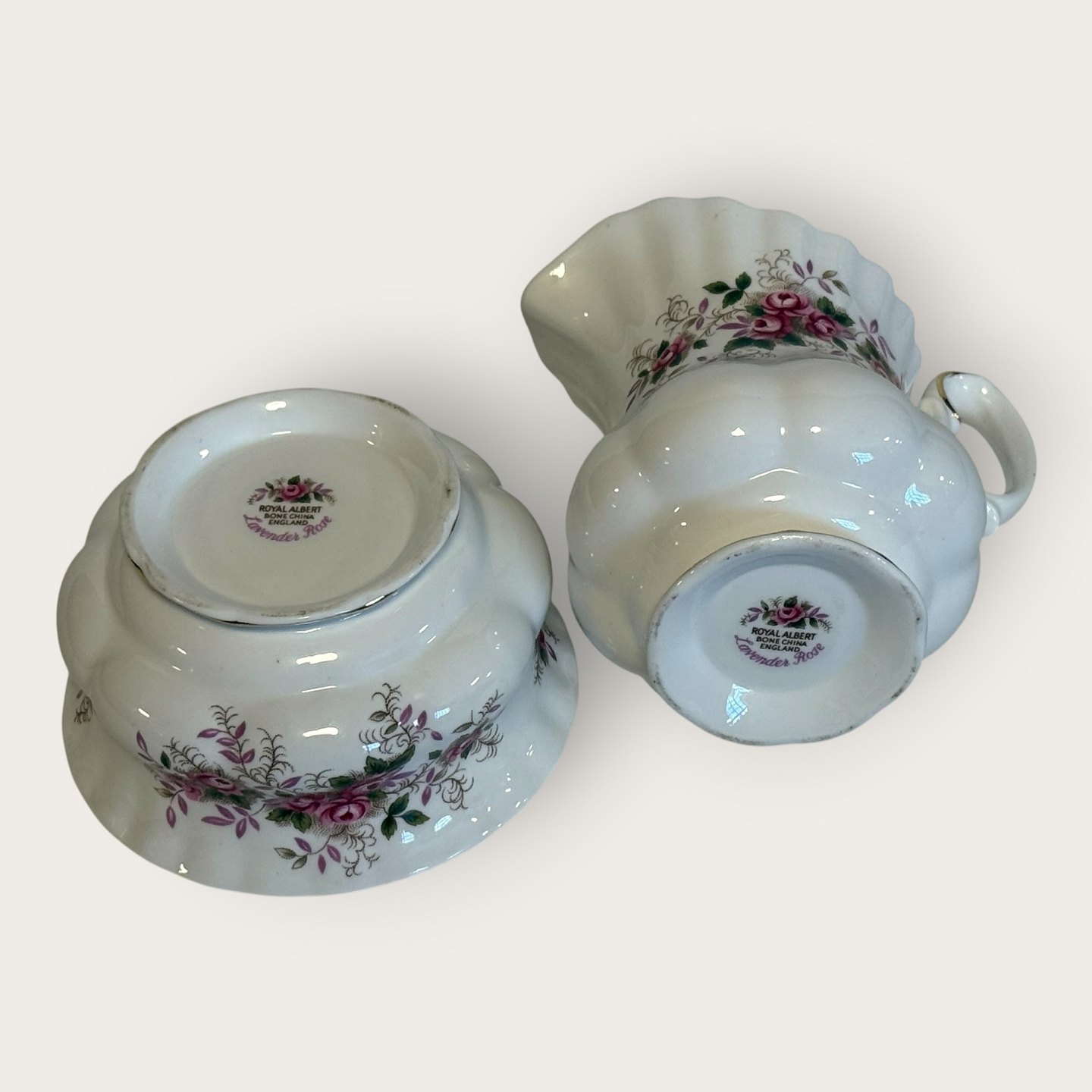 Royal Albert, Bone China, Lavender Rose, Stort Sukker og flødesæt, sukkerskål højde 6cm, diameter 11cm, flødekande ca. hxbxl 10,5x12x8,5cm *Perfekt stand*
