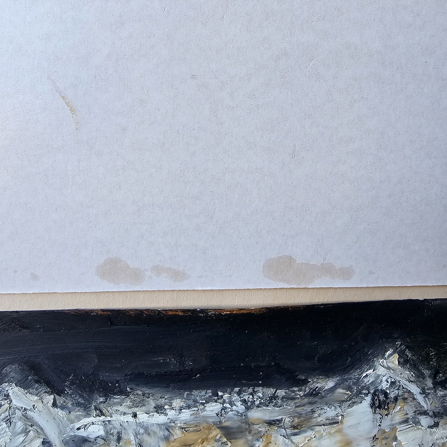 Oliemaleri på papir med abstrakt motiv af mennesker. Monteret i sølvfarvet ramme, dateret 1987