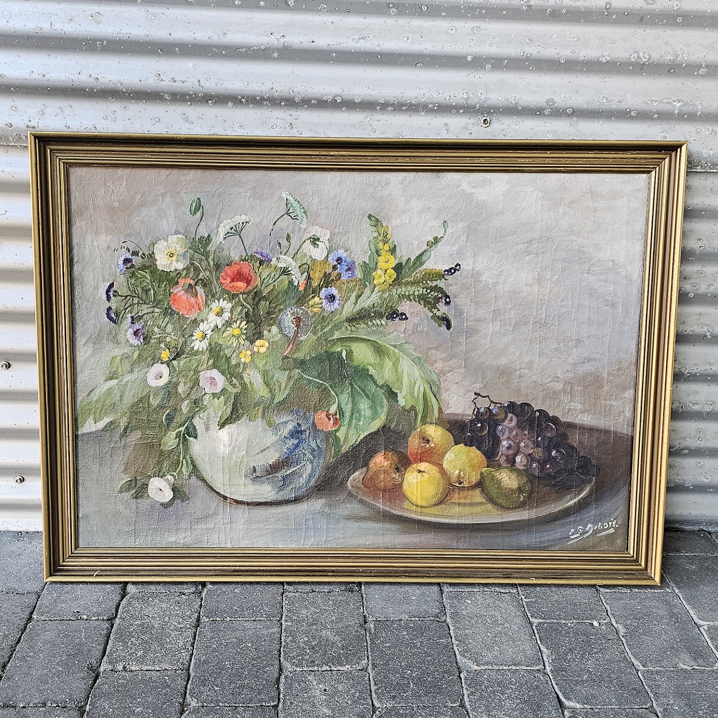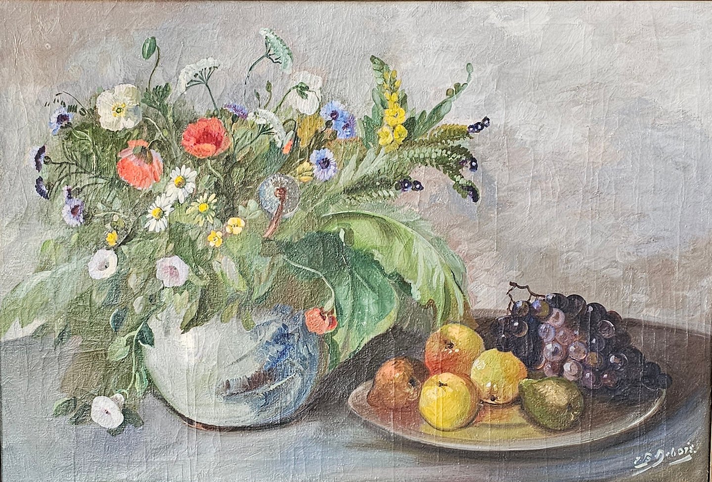 Oliemaleri på lærred med motiv af en frugtskål og en vase med vilde blomster. Monteret i guldmalet ramme