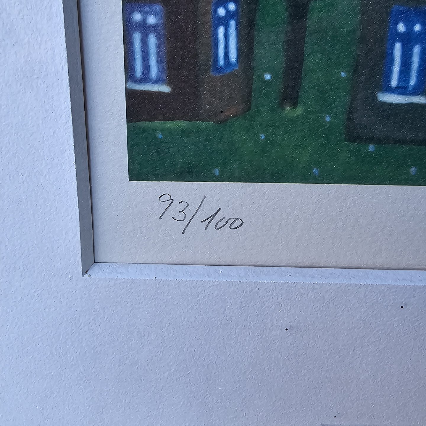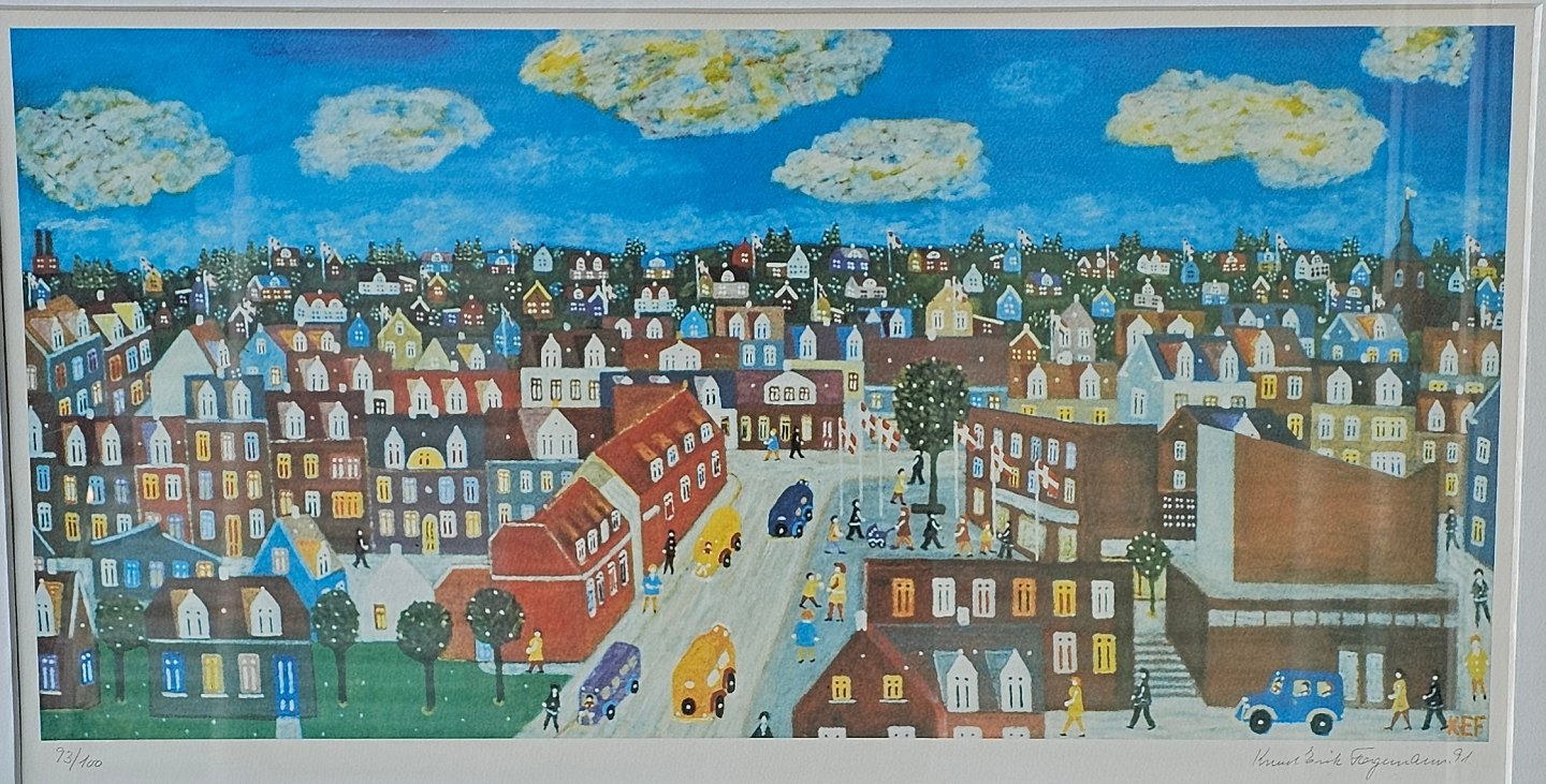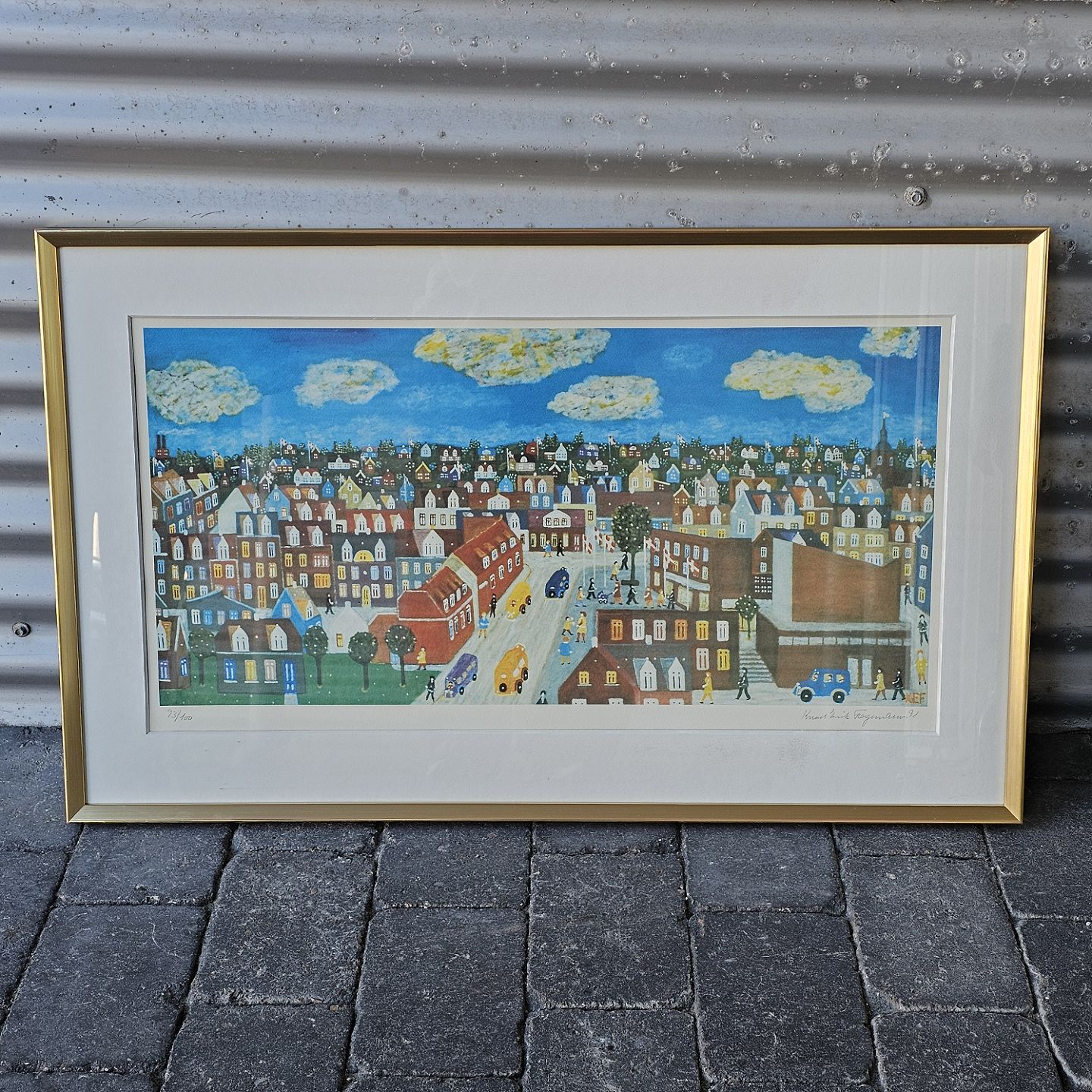 Litografi på papir med motiv af et farverigt bybillede monteret i guldfarvet metalramme. Nr. 93/100, dateret 1991