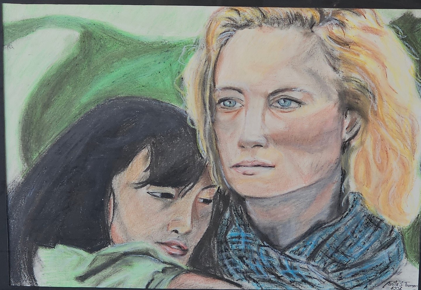 Oliekridt maleri på papir med motiv af en lyshåret og en mørkhåret kvinde. Monteret i metalramme, dateret 1996