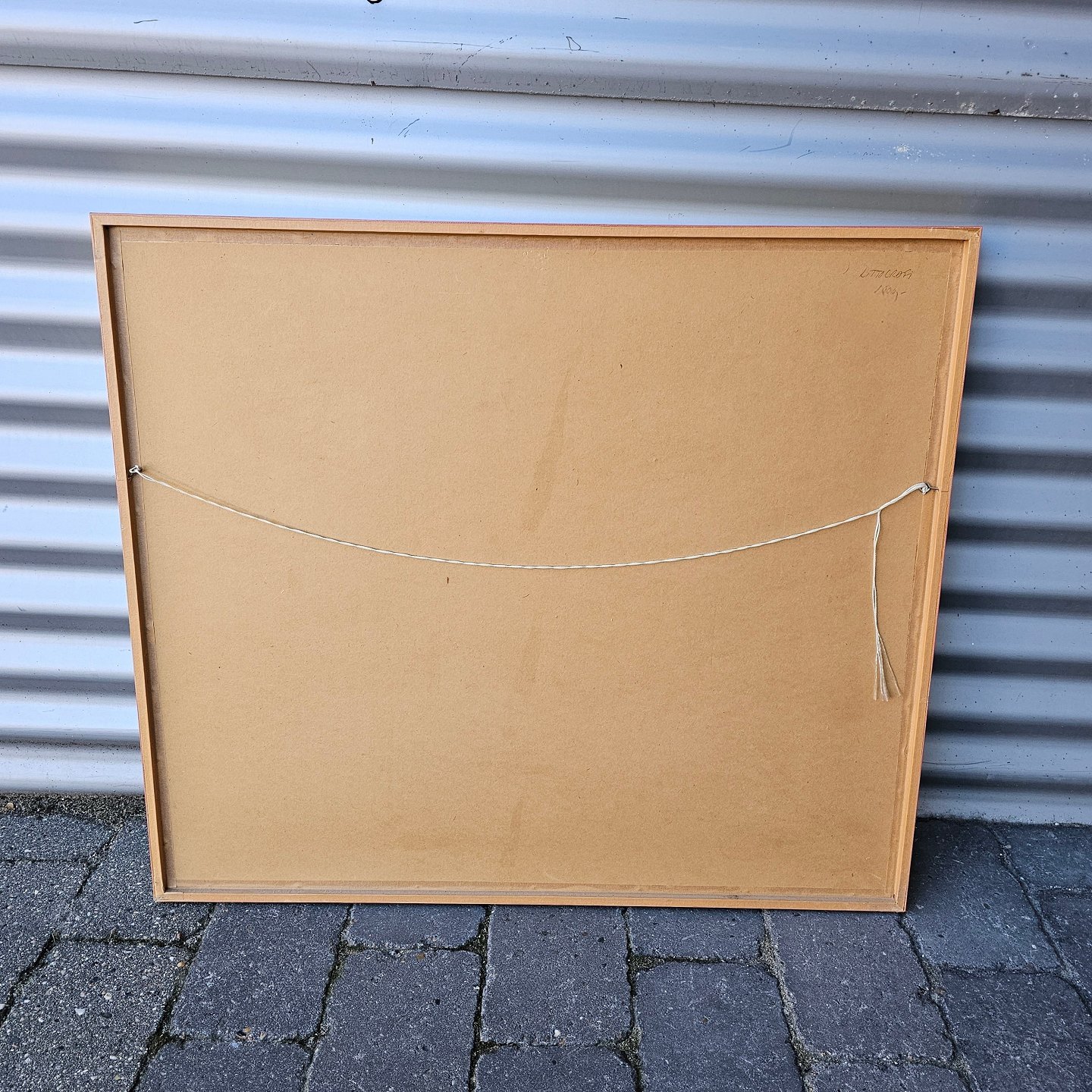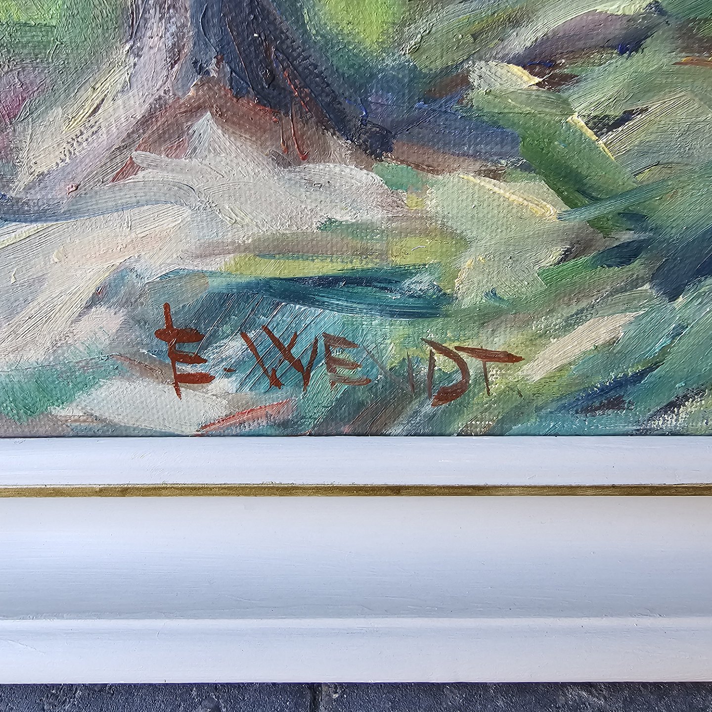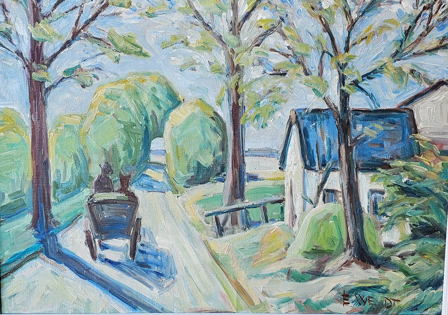 Oliemaleri på lærred med motiv af en vogn på en landevej monteret i gråmalet træramme