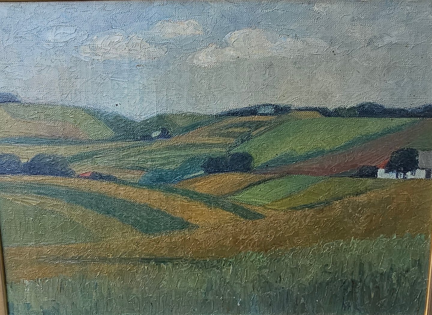 Oliemaleri på lærred med motiv af Mols Bjerge monteret i guldmalet træramme