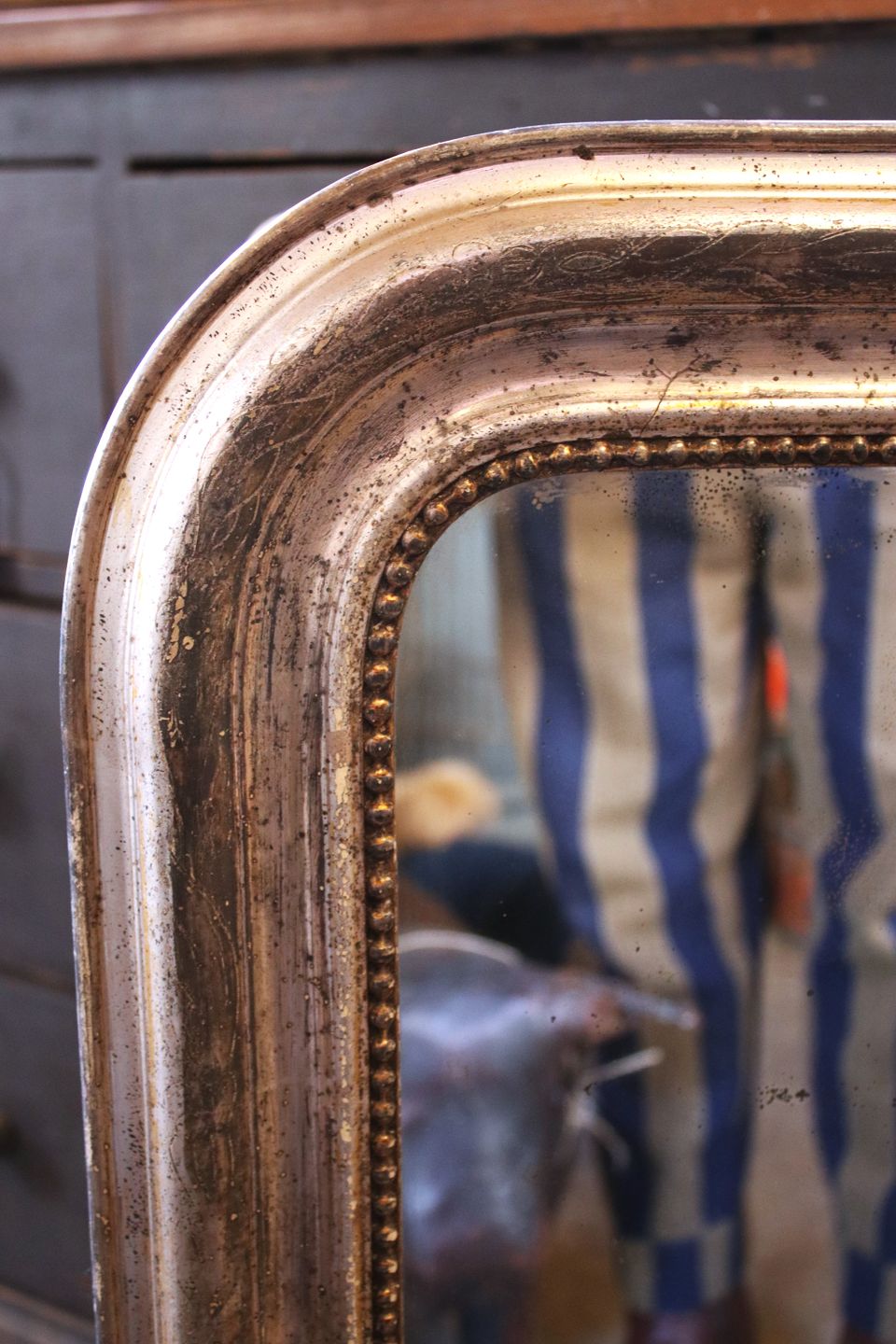 Fransk 1800 tals Louis Philippe sølv kamin spejl med fin dekoreret ramme med perlekant og originalt gammelt spejlglas med en super fin patina. Mål: H:86,5cm. B:65cm.