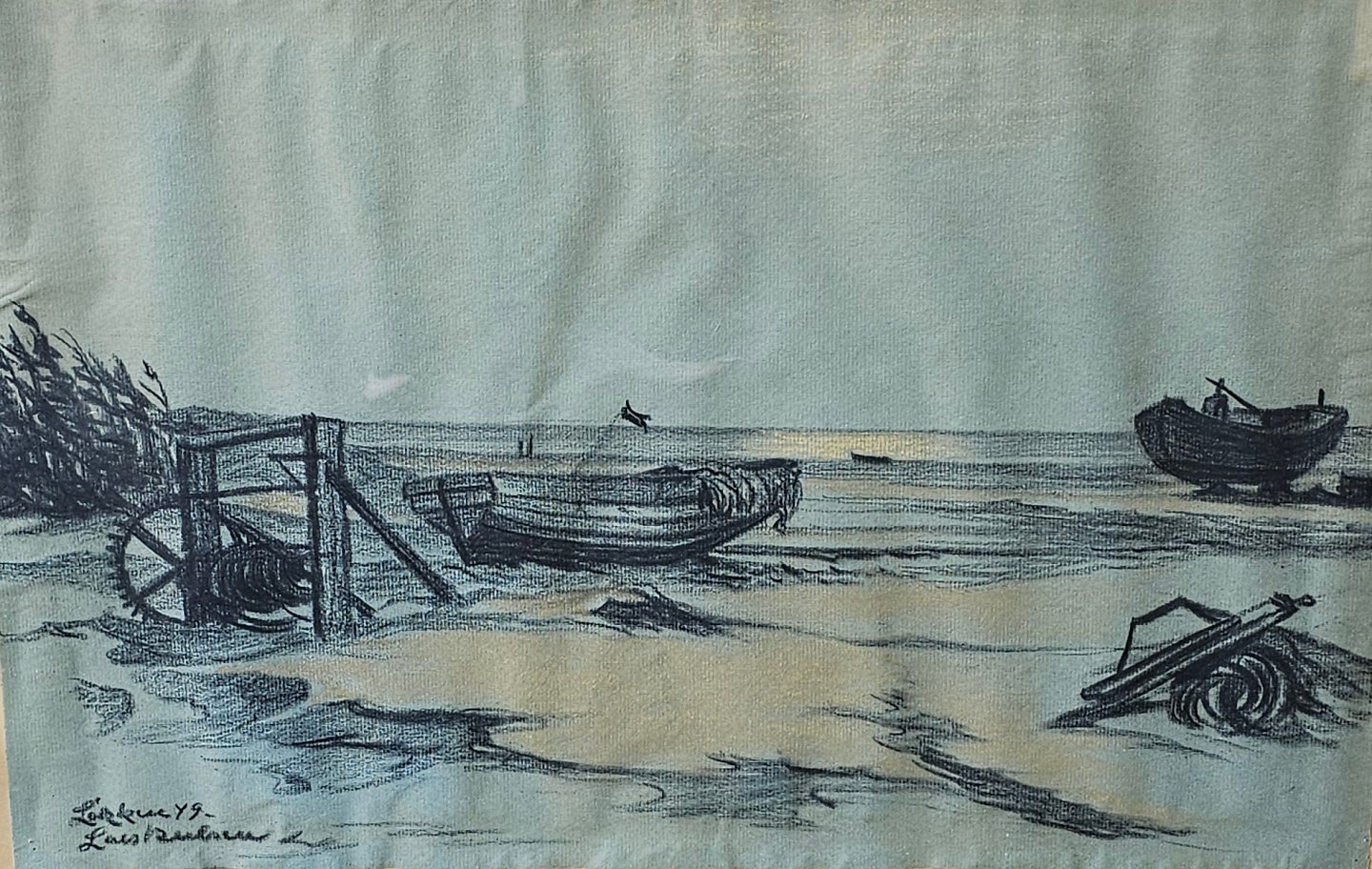 Kul eller kridt tegning på papir med motiv af både på en strand i Løkken. Monteret i sortmalet træramme, dateret 1949