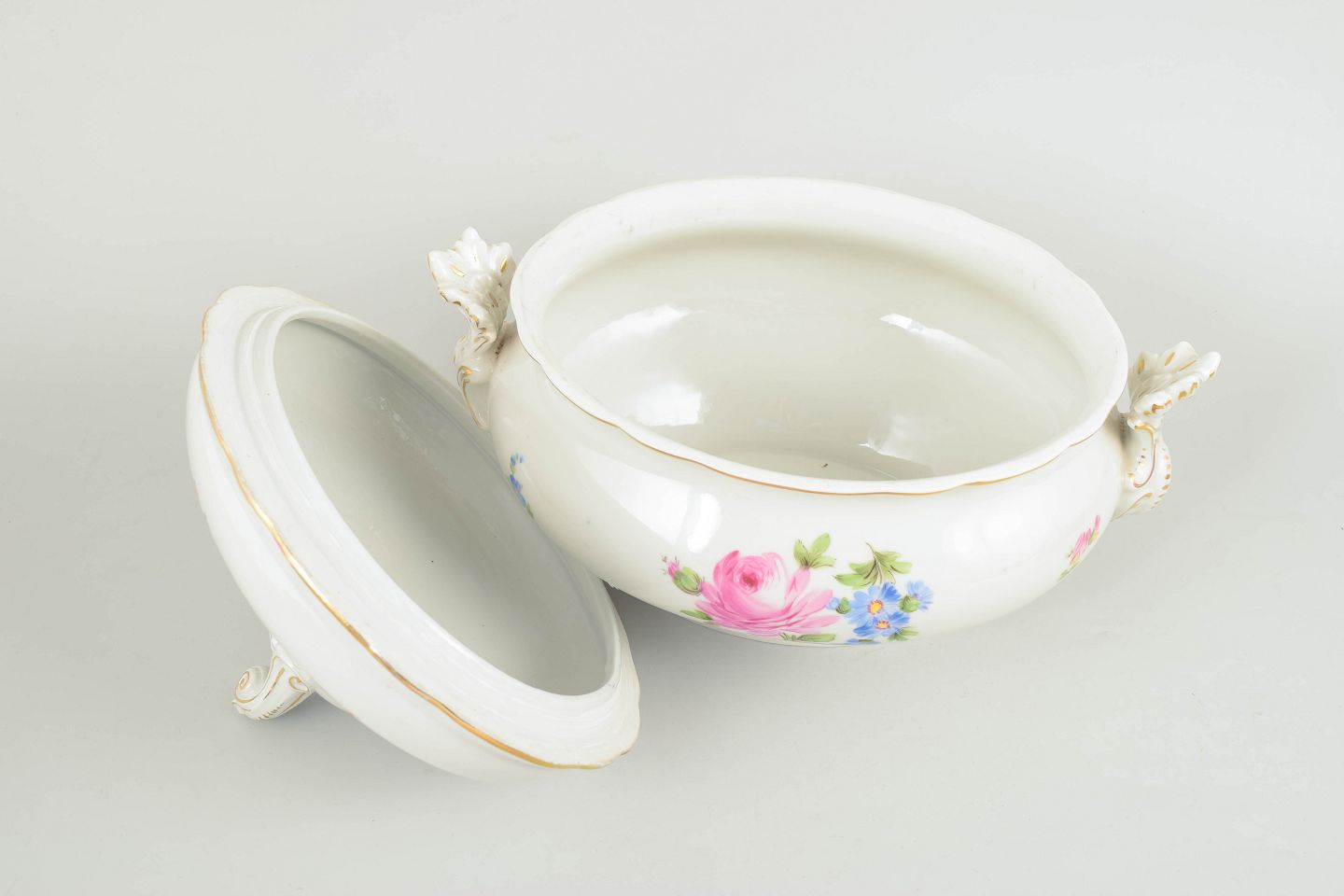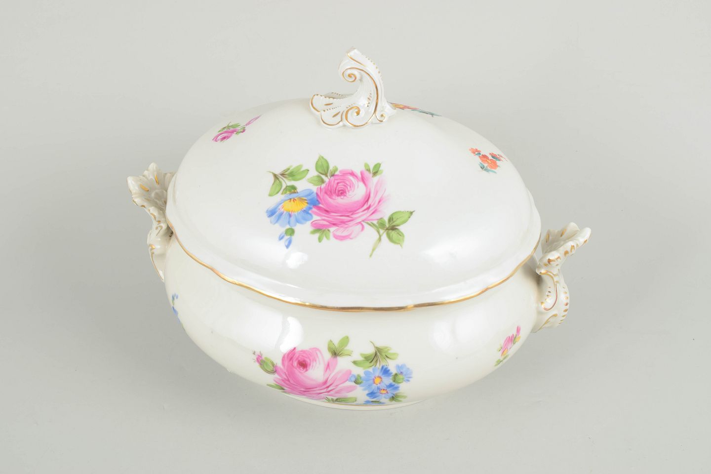 Stor terrin i håndmalet porcelæn med floral dekoration i polykrome farver og forgyldte detaljer, udført i klassisk Saksisk blomst mønster. Uden synlig fabriksmærkning.