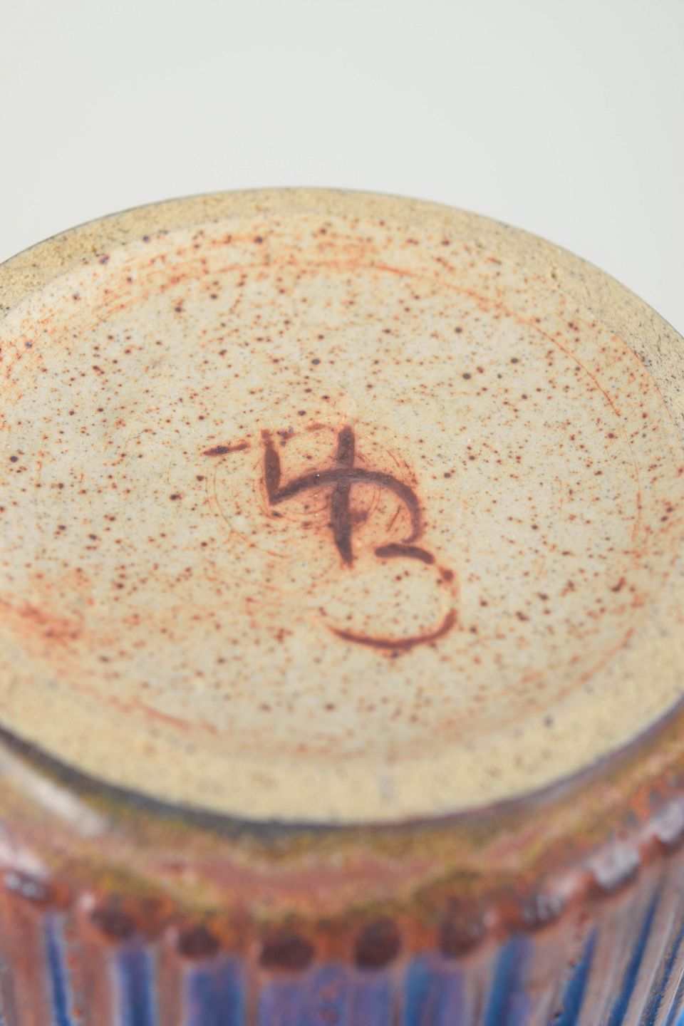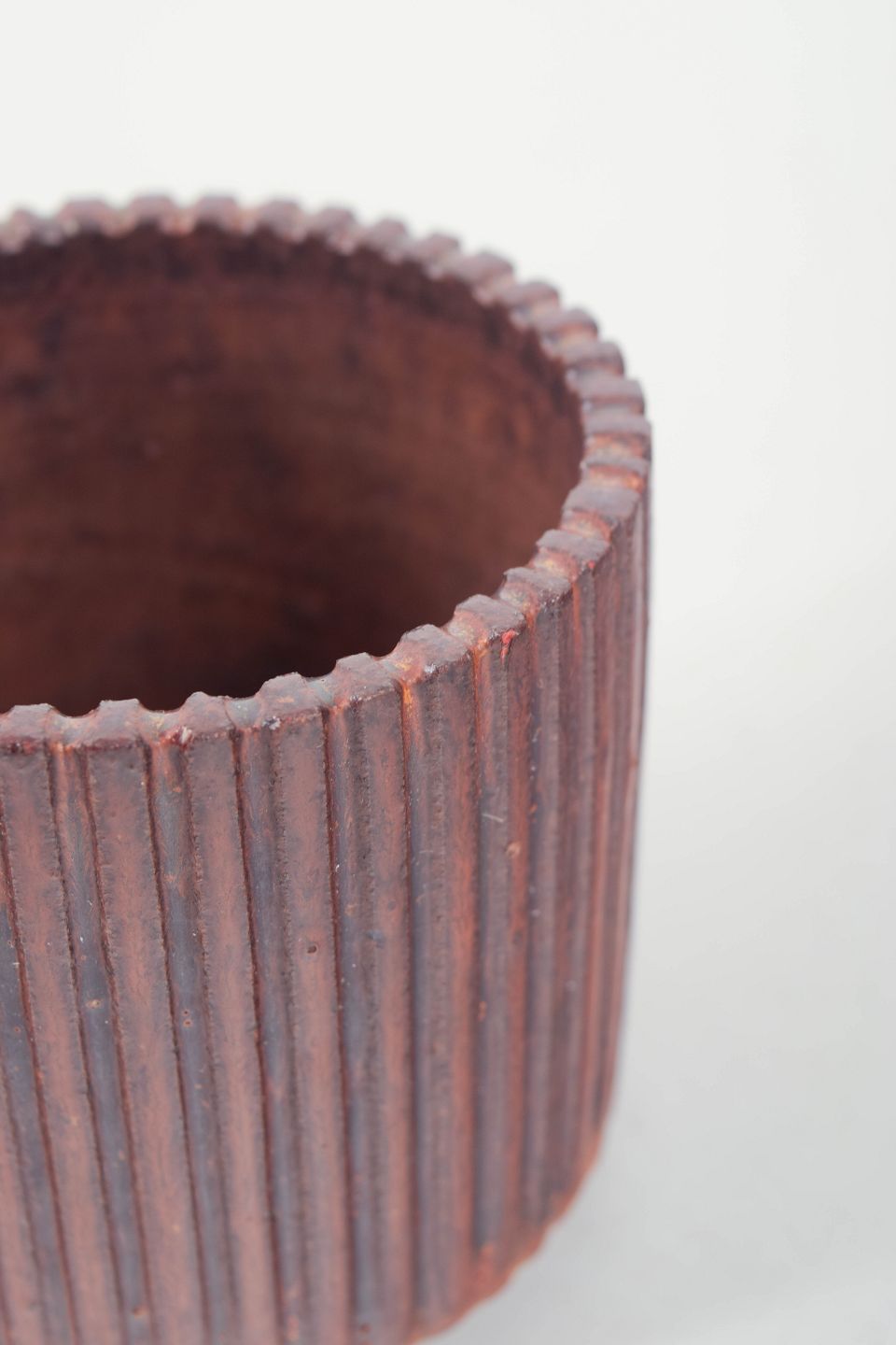 Cylindrisk vase i stentøj med lodrette riller og dyb brunviolet glasur med varme nuancer.