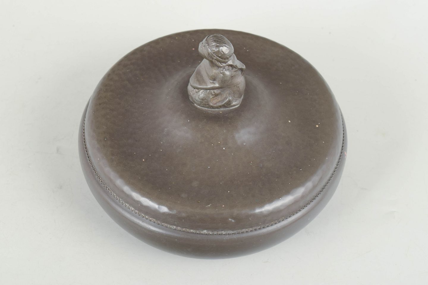 Art deco lågskål i tin med rund, blød form og låg afsluttet med dekorativ figur som knop.