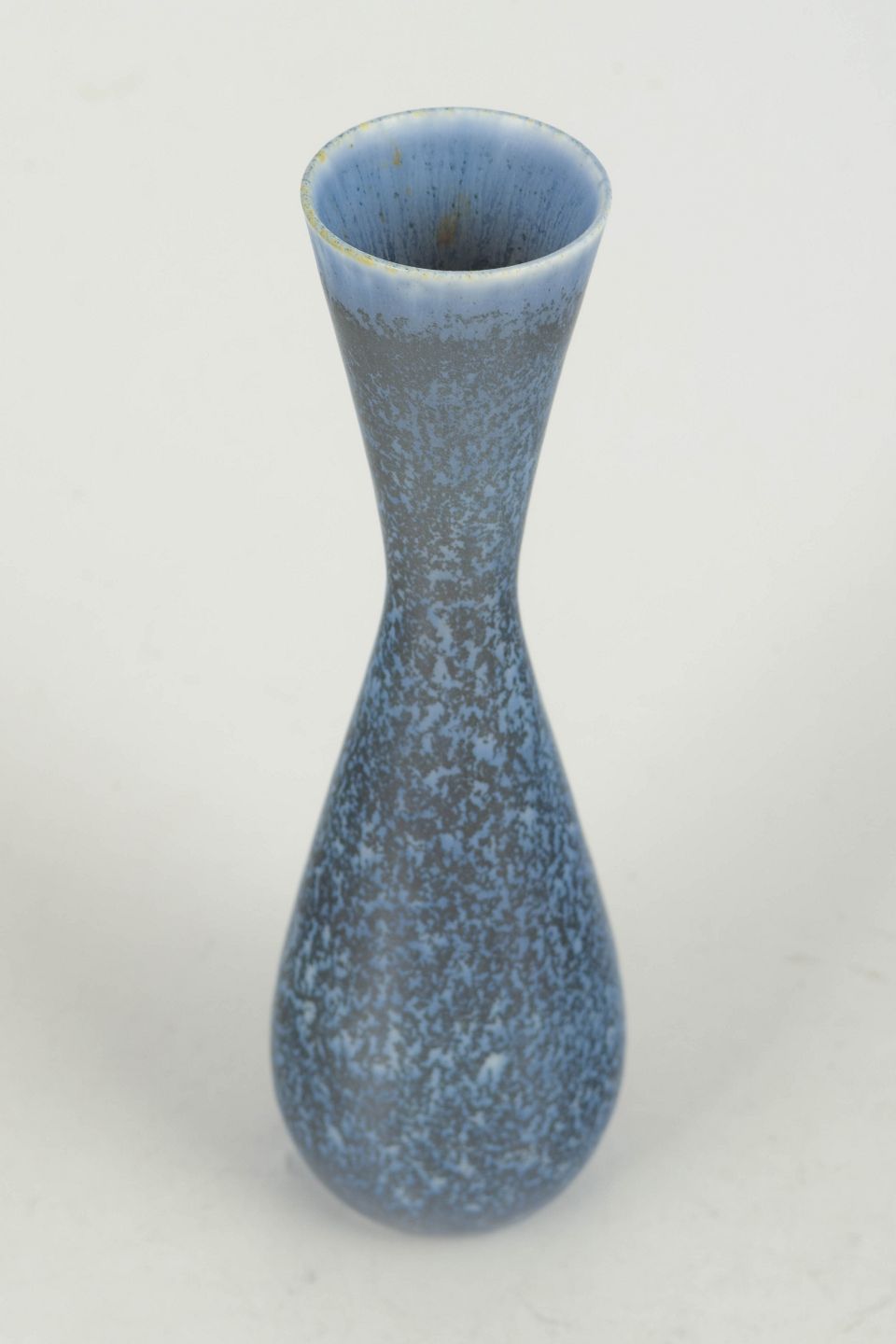 Slank, organisk formet vase i stentøj med smuk blåmeleret glasur og let indsnævret hals. Et karakteristisk eksempel på Stålhane’s arbejde med enkle former og levende glasurer.