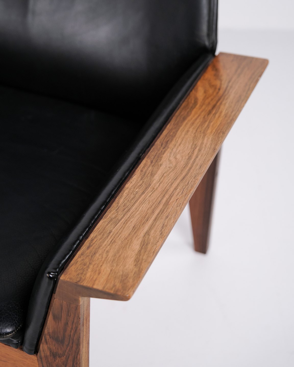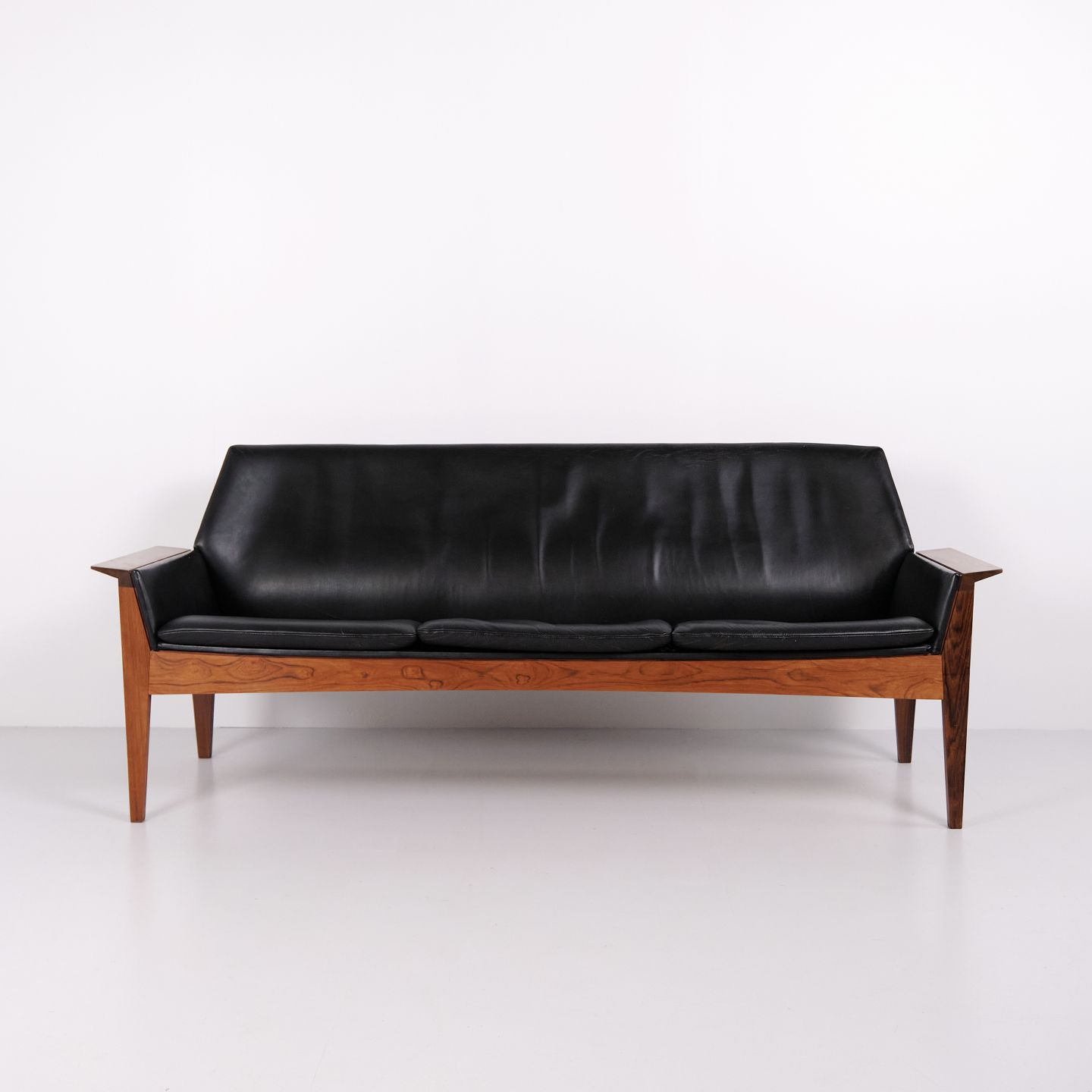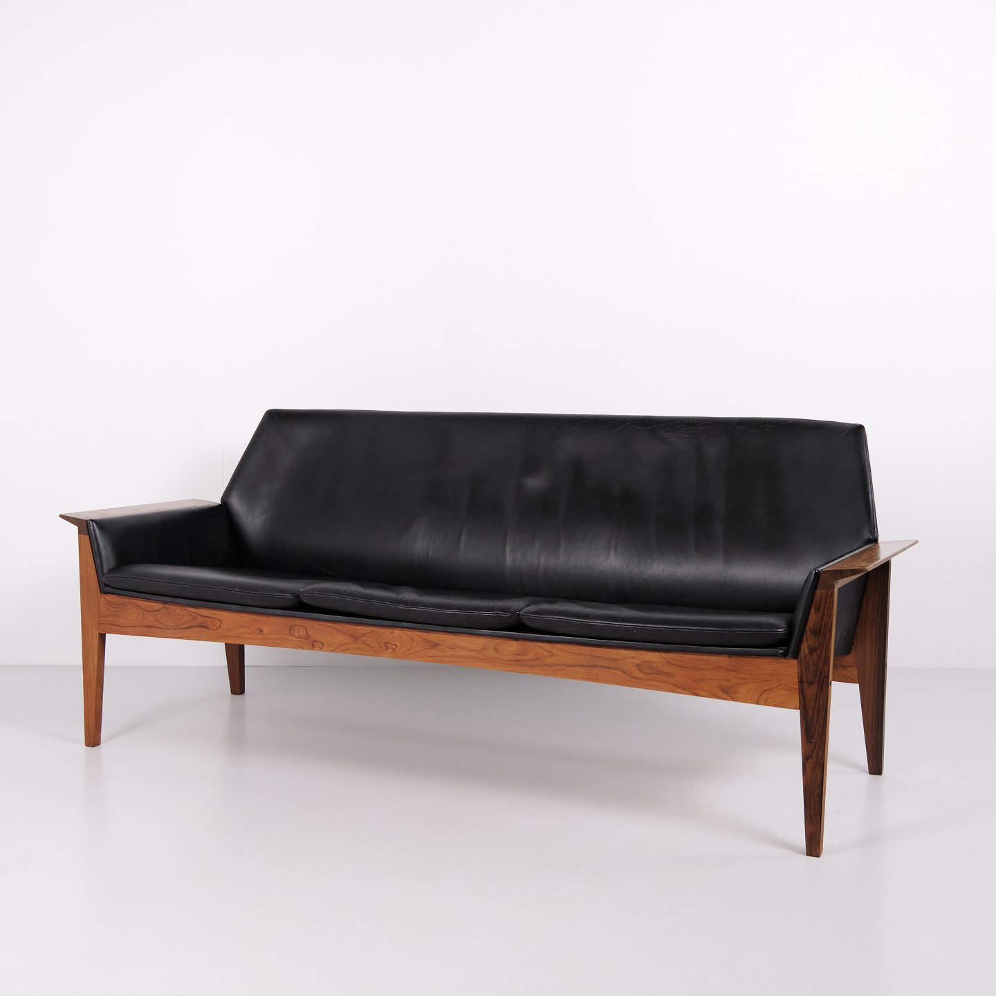 Tre personers sofa designet af Steen Østergaard for Jason Møbler i 1960’erne. Udført med stel i rio palisander og original sort læderpolstring. Modellen har stramme linjer, lave proportioner og et enkelt formsprog typisk for dansk modernisme. Steen Østergaard blev uddannet snedker og studerede ved Kunsthåndværkerskolen i København. Han arbejdede for Finn Juhl fra 1962 til 1964 og etablerede egen tegnestue i 1966. Østergaard er kendt for sit arbejde med nye materialer, industriel produktion og møbler for blandt andet Cado, France & Son og Abstracta.