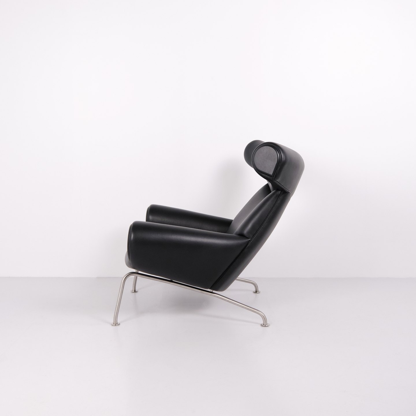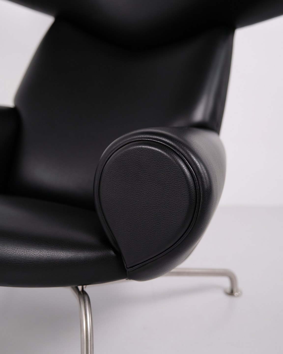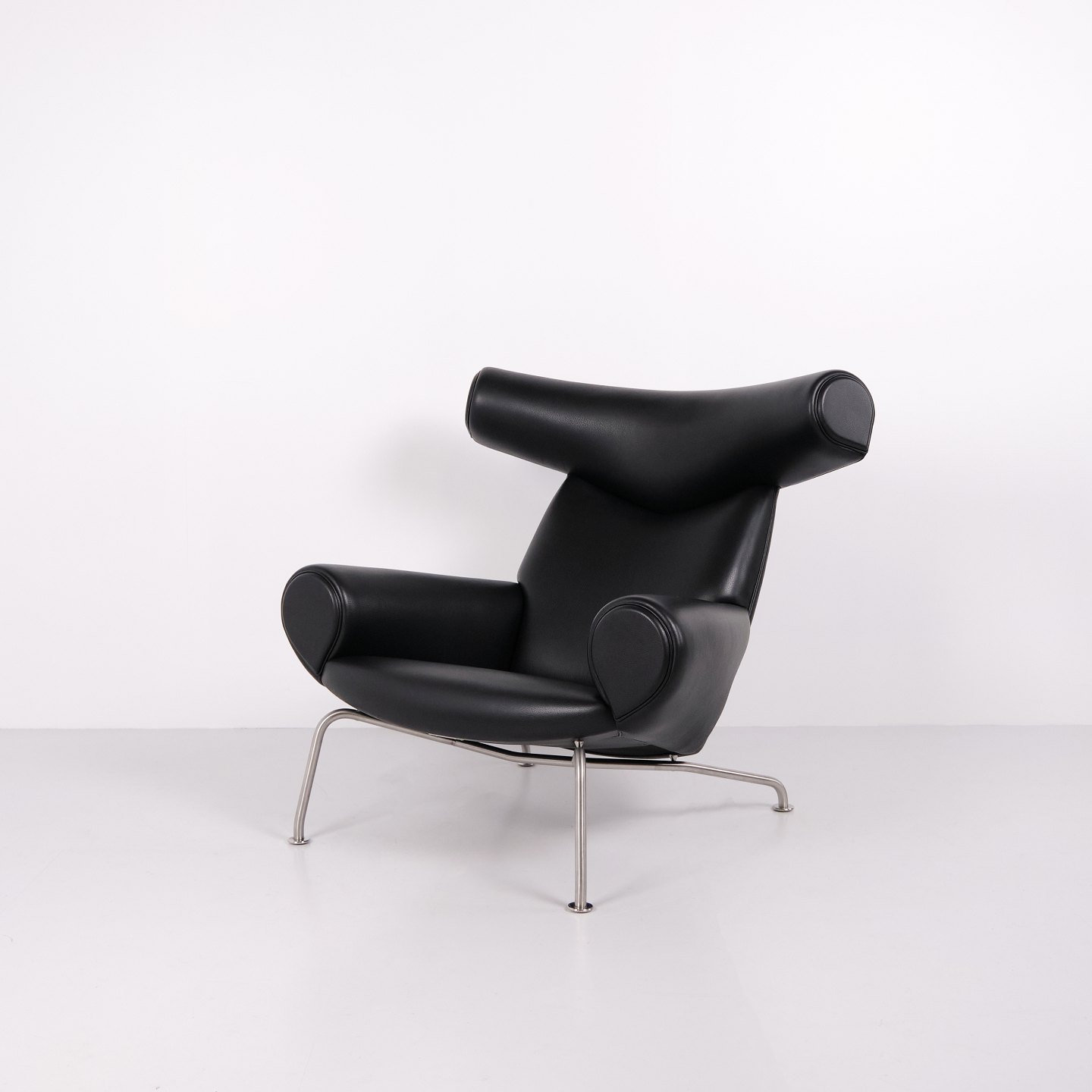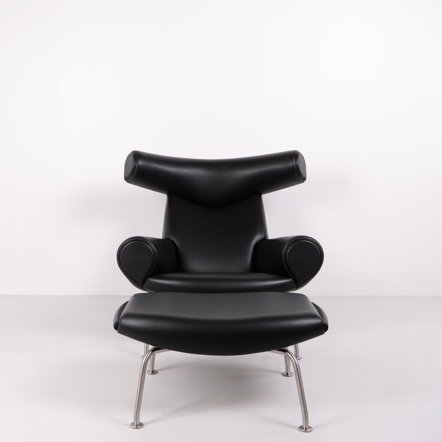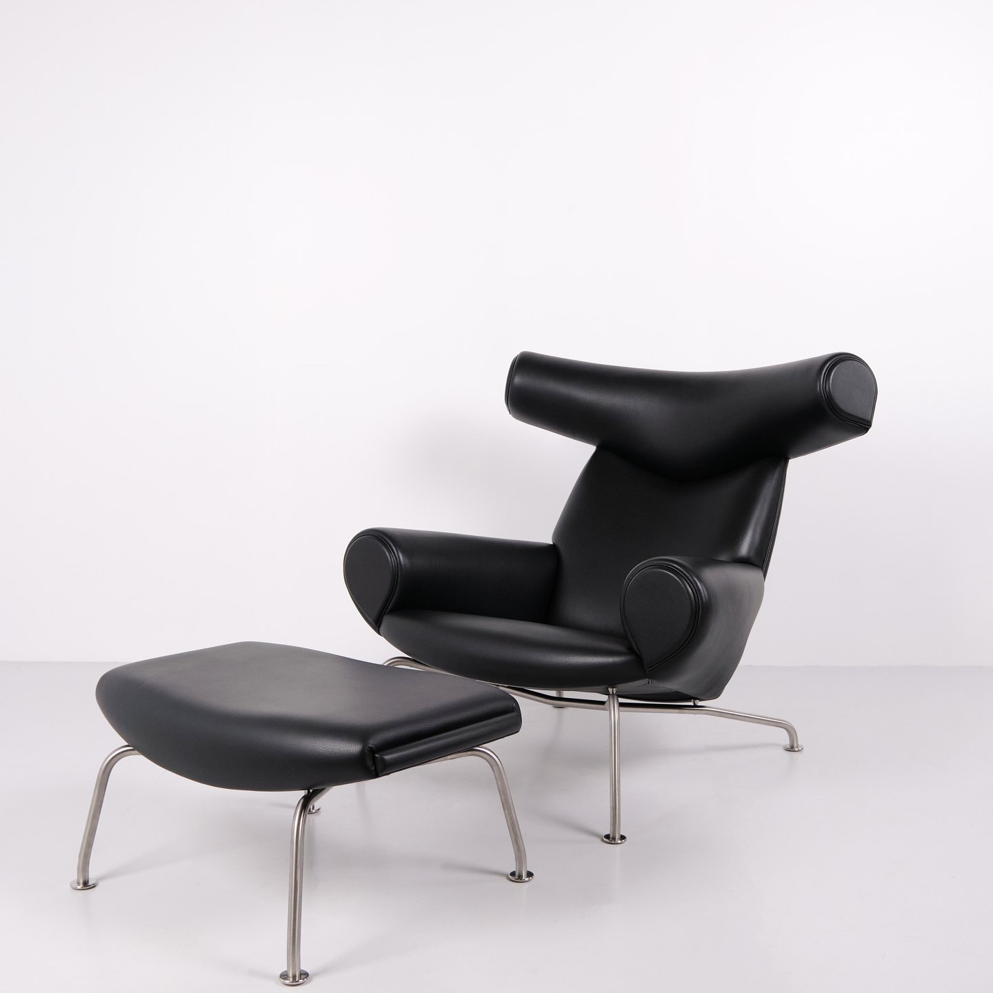 Ox Chair model EJ100 med tilhørende skammel designet af Hans J. Wegner. Modellen blev tegnet i 1960 og produceres i dag af Fredericia Furniture efter overtagelsen af Erik Jørgensen. Stolen er udført i sort læder med stel i stål. Det markante ryglæn med “horn” gav modellen navnet Ox Chair. ´