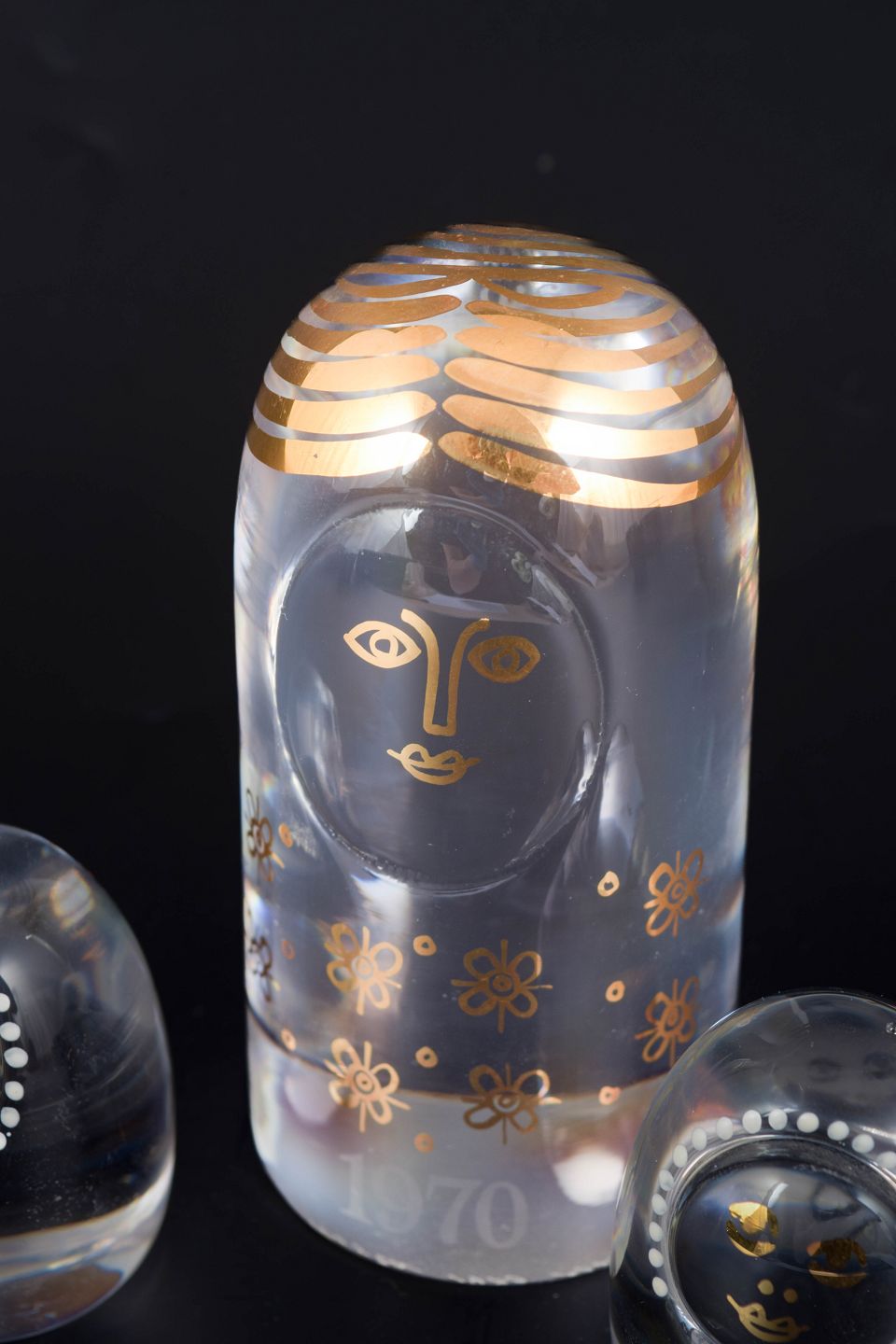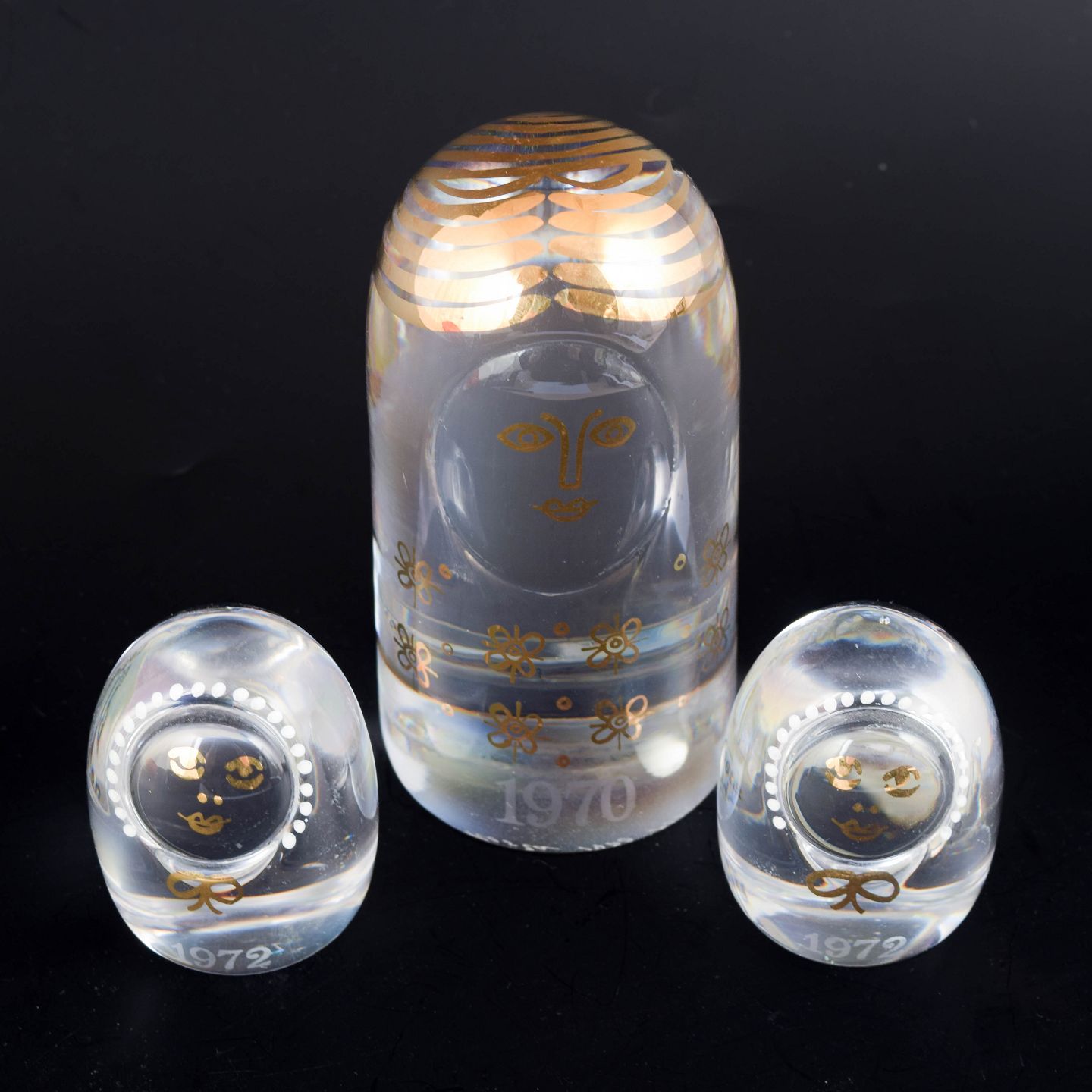 Håndlavede kunstglasfigurer i klart glas med stiliserede ansigter og dekorative hvide og gyldne blomstermotiver, udført som en mindre familiegruppe.