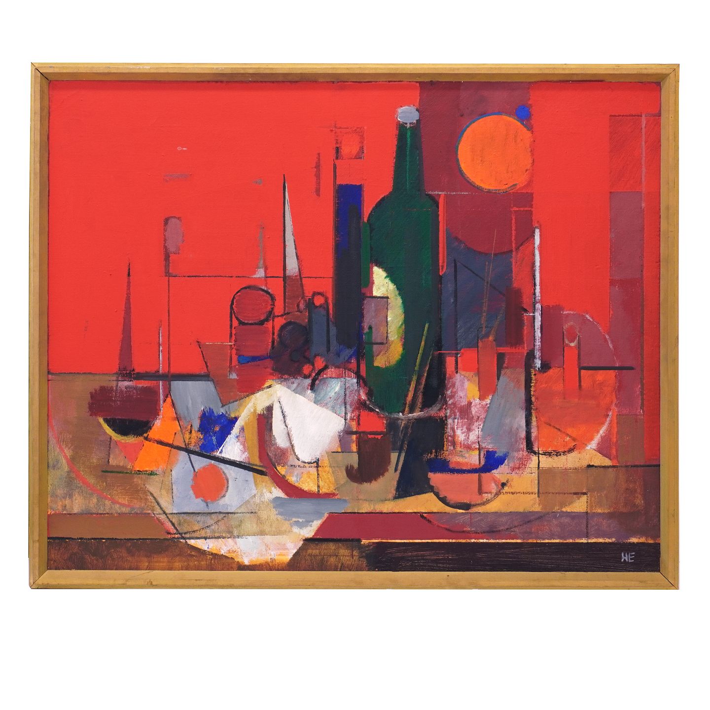Maleri Helge Ernst. Helge Ernst, 1916-91, olie på lærred. "Den Grønne Flaske". Signere tog dateret 1975. Lysmål: 59x73cm. Med ramme: 64x78cm