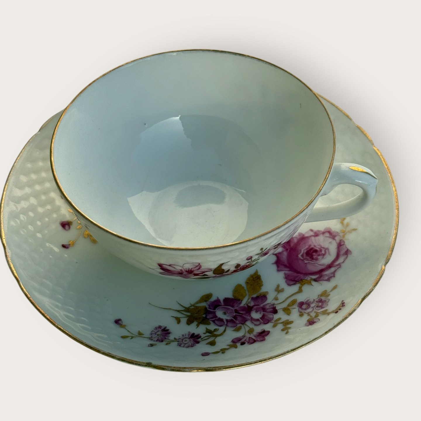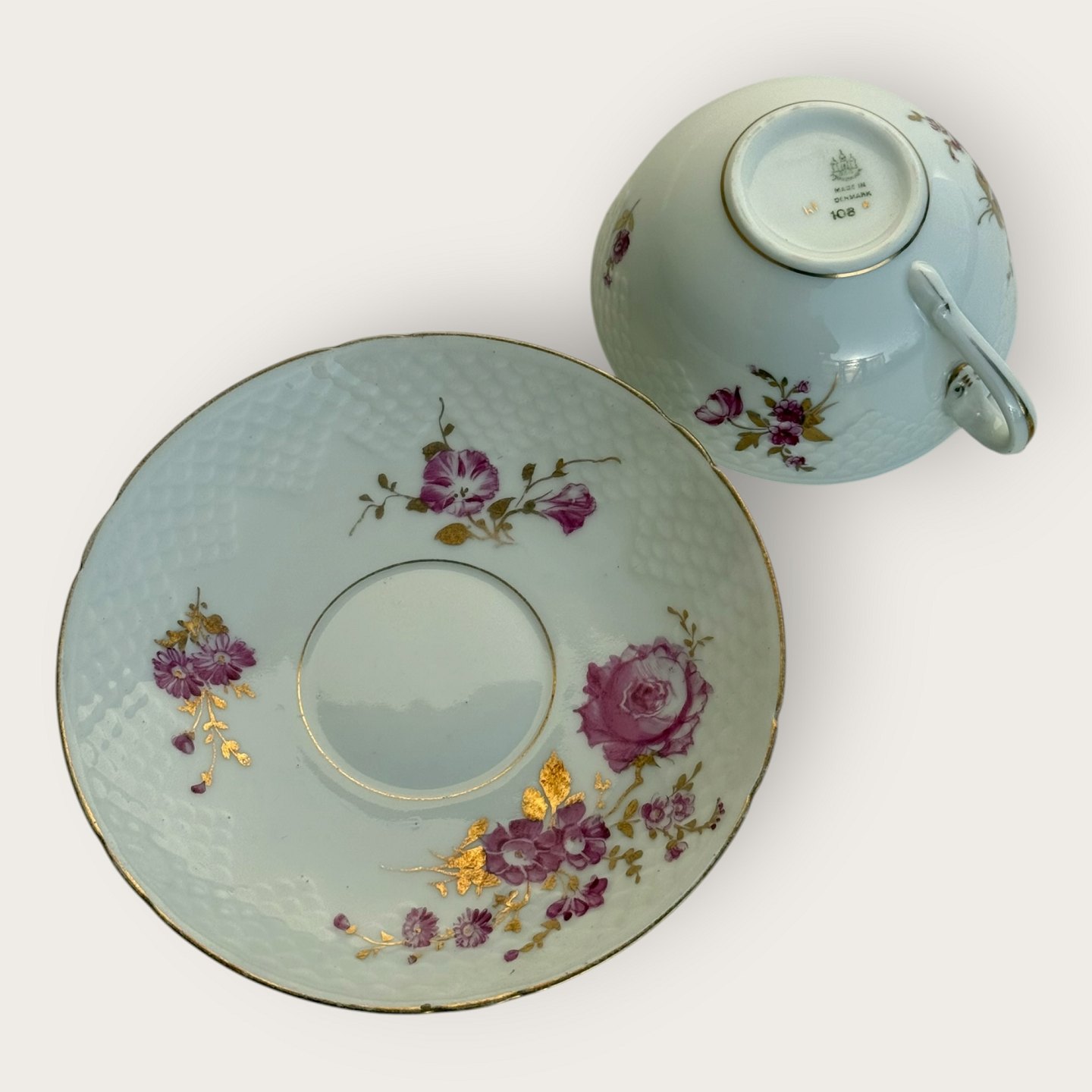 Bing & Grøndahl, Røde blomster med guld blade guldkant, Tekop sæt #108, 4,7cm høj, 10cm i diameter, 1.sortering *Pæn brugt stand*