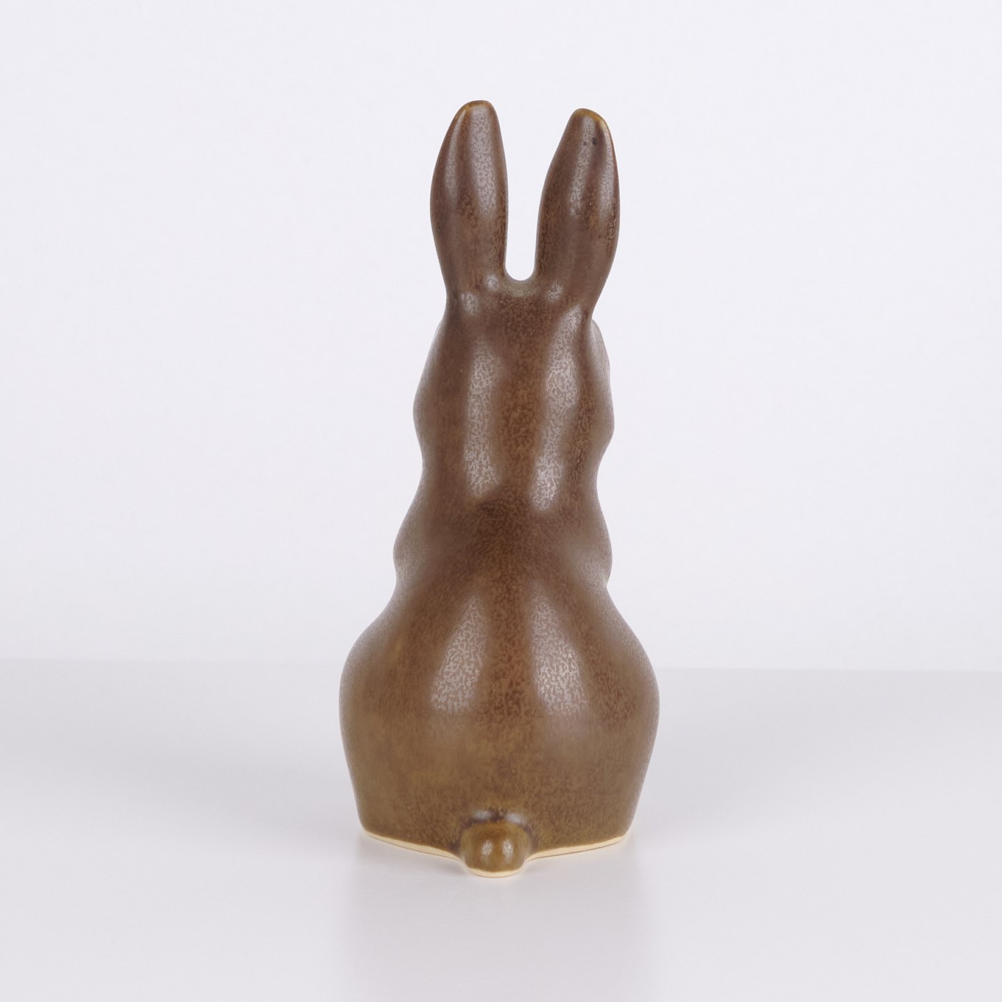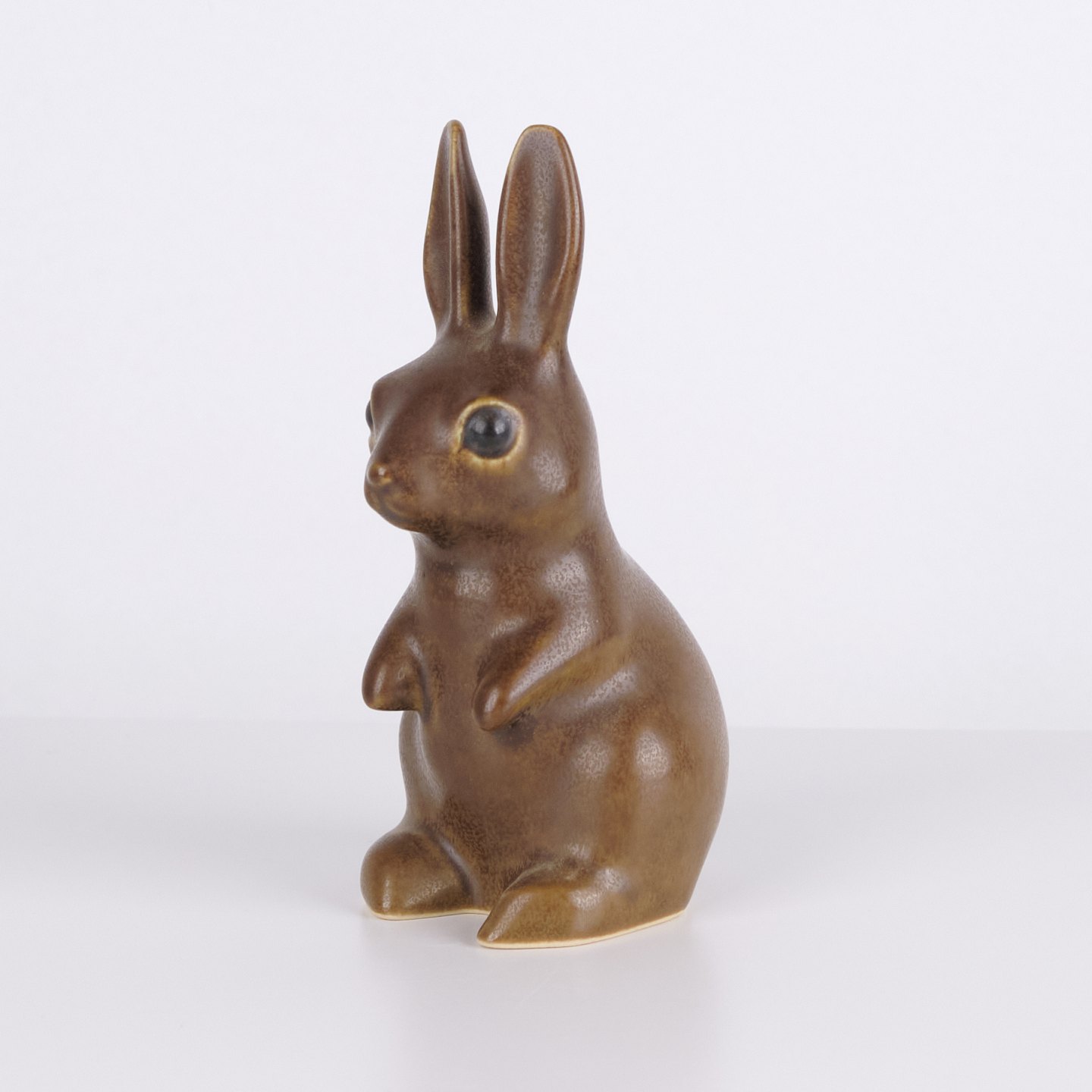 Stor harefigur af Knud Basse udført i brun glaseret keramik. Figuren er modelleret i opret siddende form med lange ører og fine håndmalede øjne.