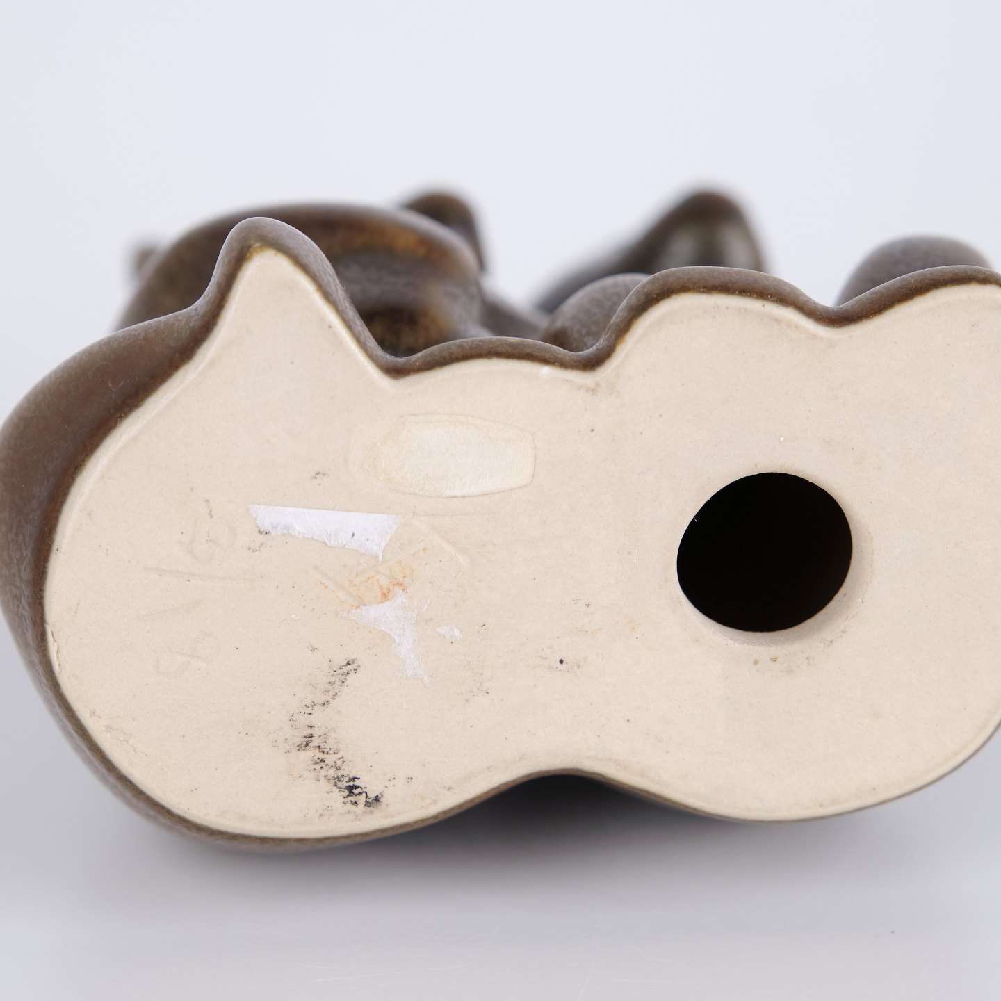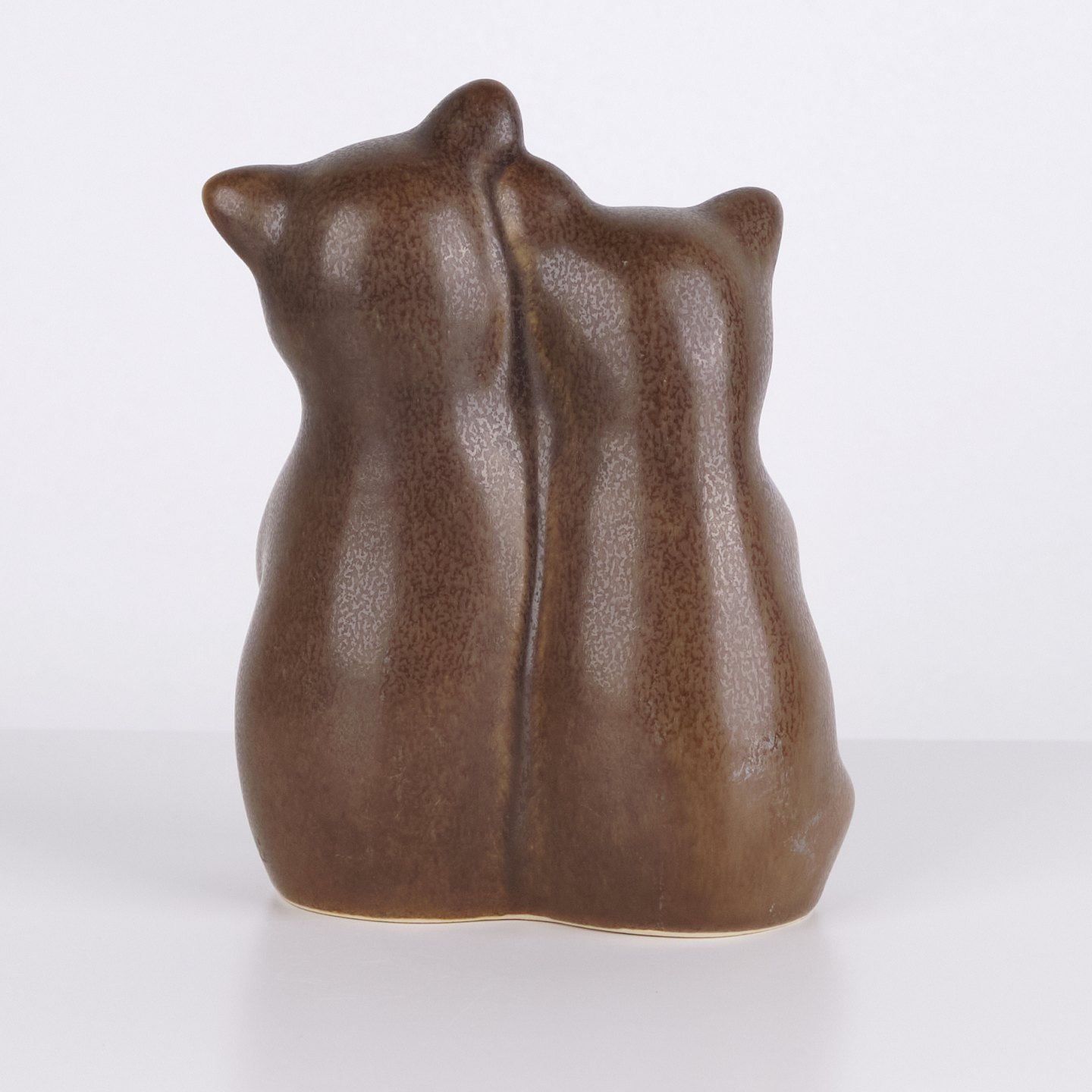 Stor dobbeltfigur af Knud Basse udført i brun glaseret keramik. Modellen viser to siddende bjørne placeret tæt sammen med fremhævede lyse brystdetaljer. En større og mere sjælden figur fra Knud Basses dyreserie, produceret i Danmark i 1960’erne.