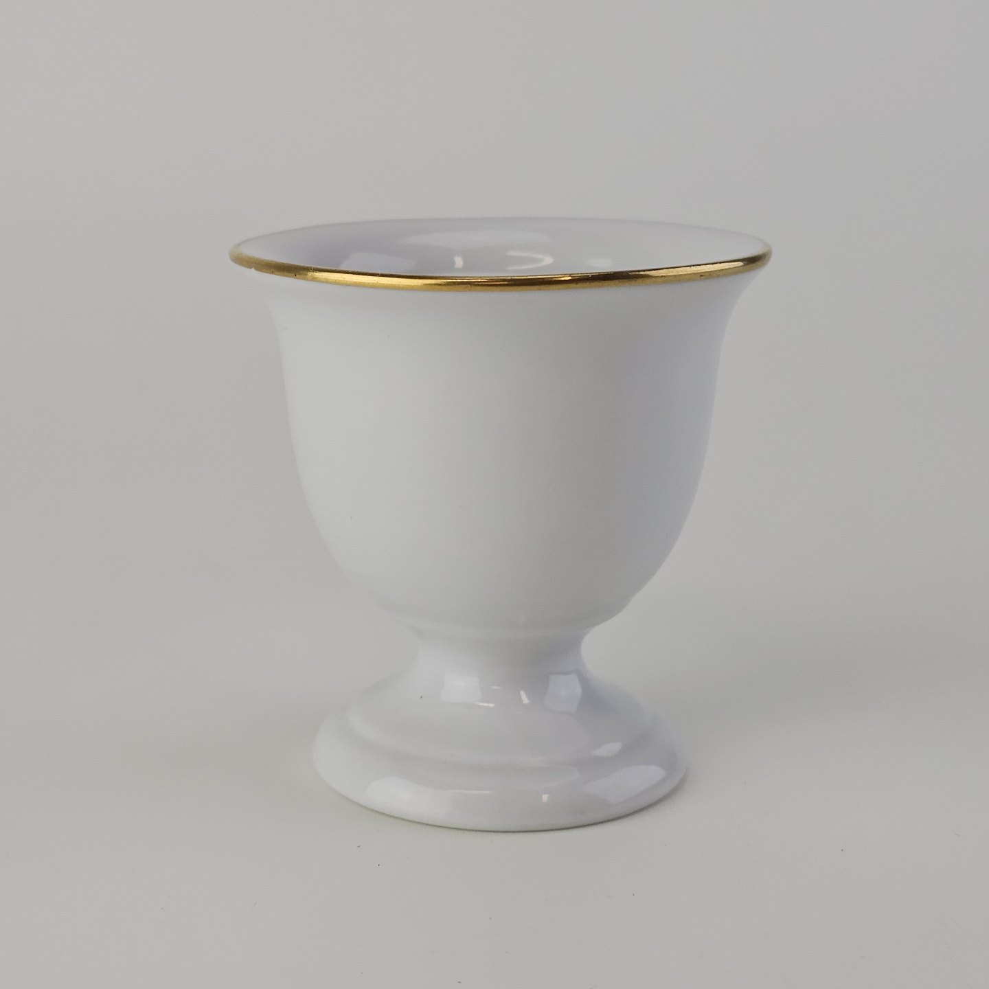 Bæger i hvidt porcelæn med guldkant og motiv af påskelilje