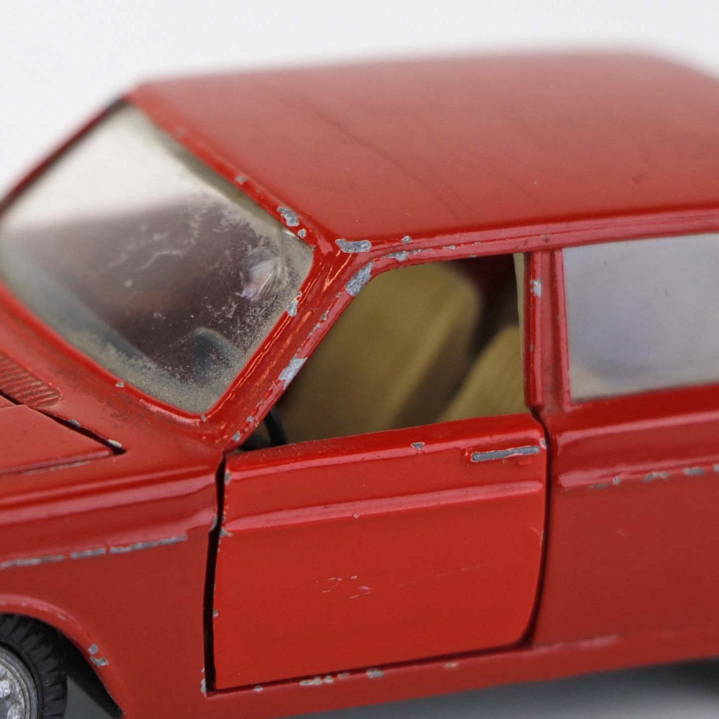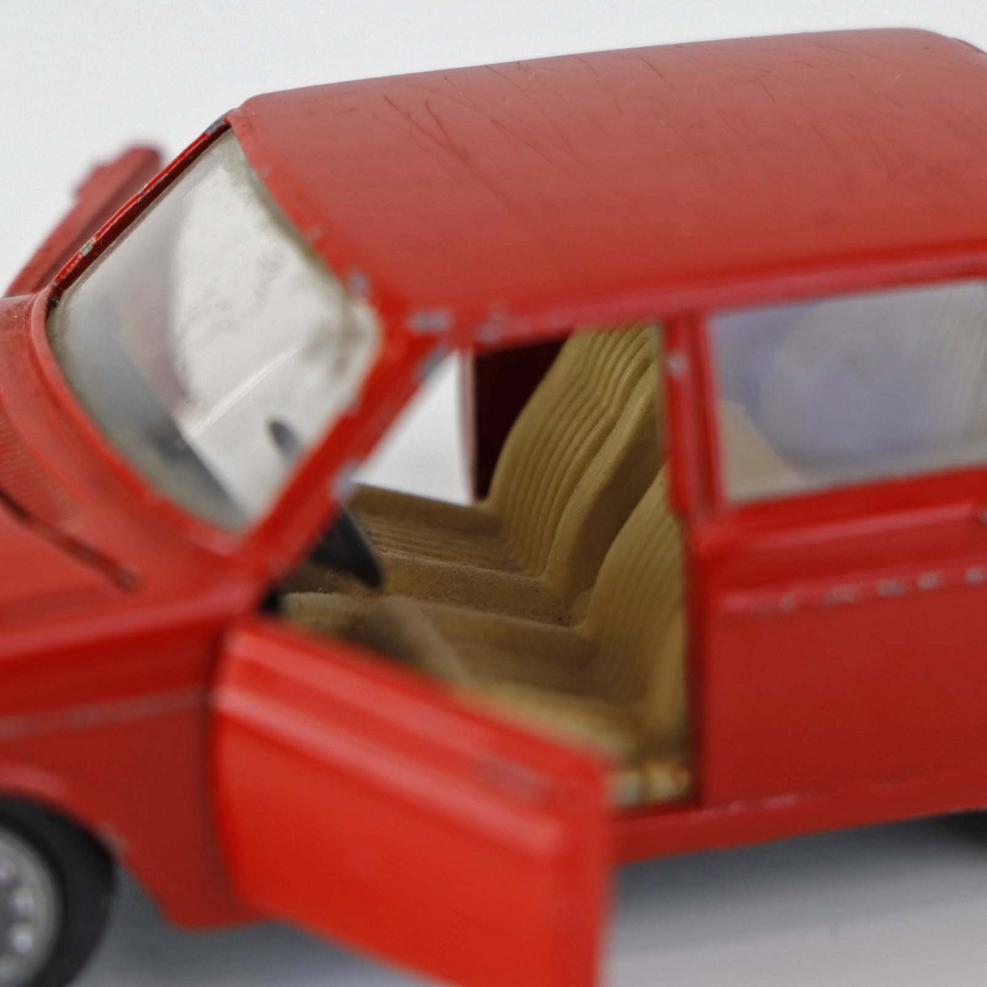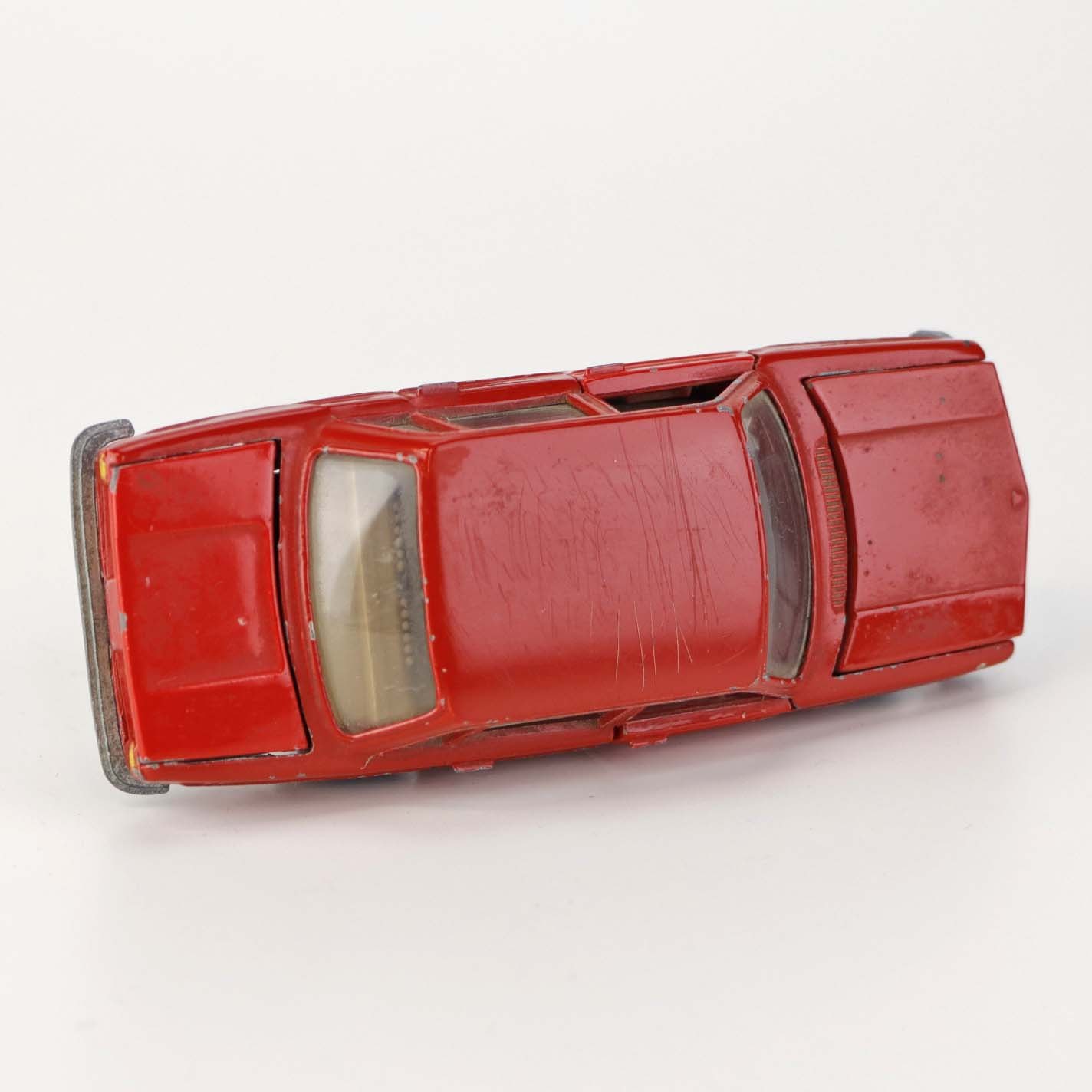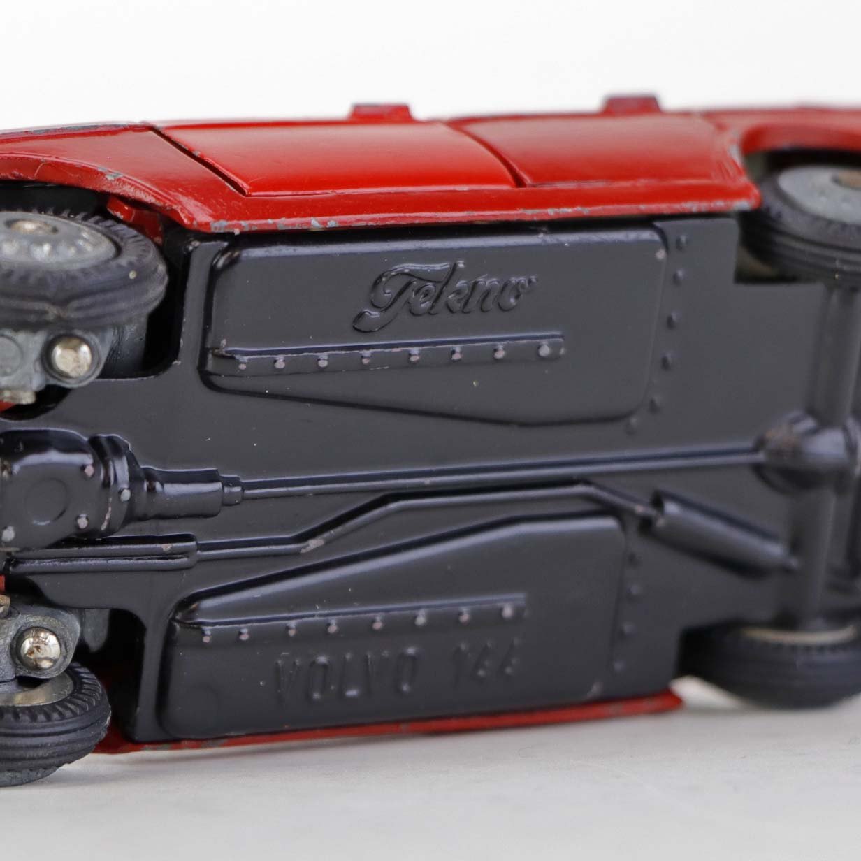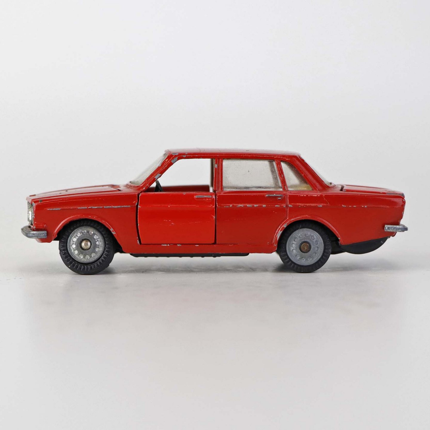 Sedan legetøjsbil i rødlakeret metal med gummi hjul. Model Volvo 144