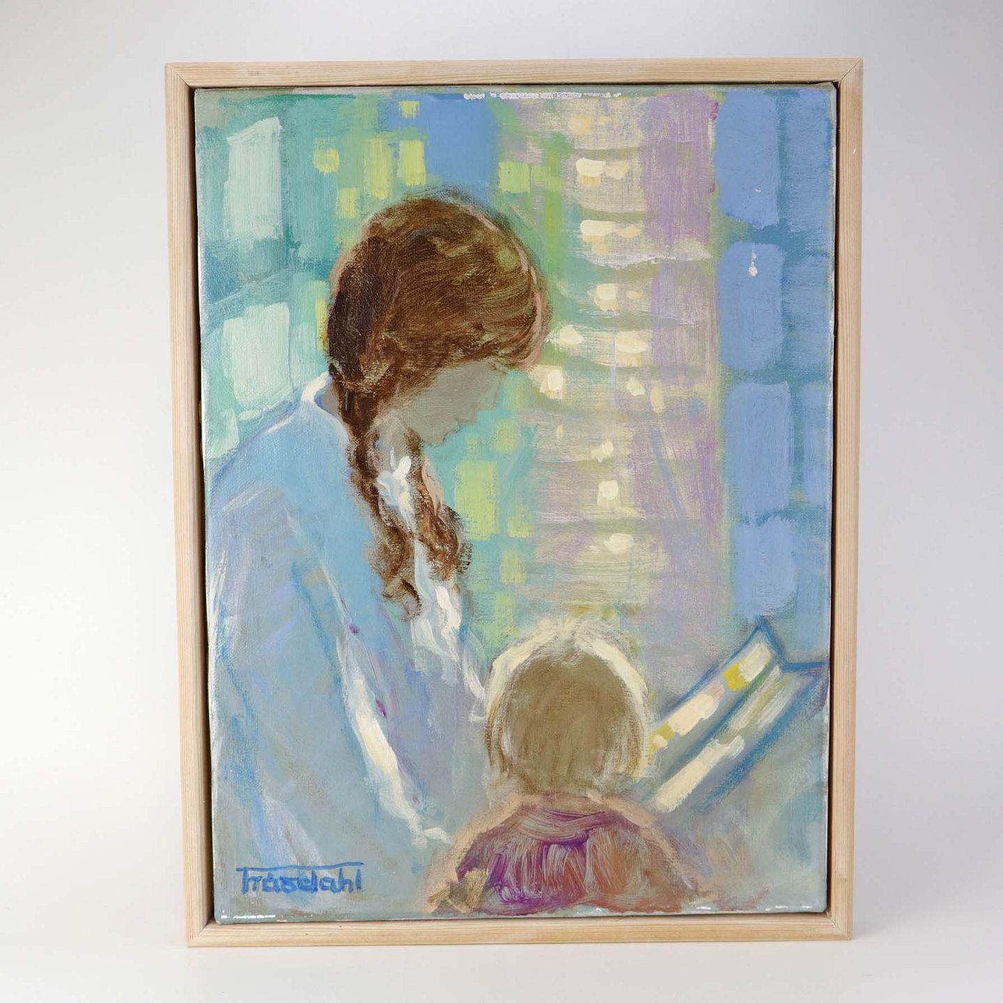 Maleri med olie på lærred i træramme. Et portrætmotiv i lyse pastelfarver af mor med barn.