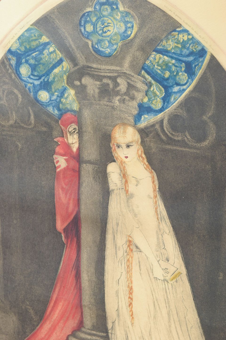 Elegant og stemningsfuld komposition med to figurer i arkitektonisk ramme, udført i Icart’s karakteristiske Art Deco stil med fine linjer og bløde farveovergange. Signeret i blyant og nummereret 70. Dateret 1928.