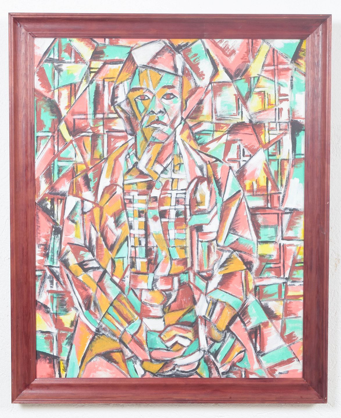 Farverig kubistisk inspireret figurkomposition med geometrisk opdelt motiv og ekspressiv penselføring, udført i olie på lærred. Usigneret.