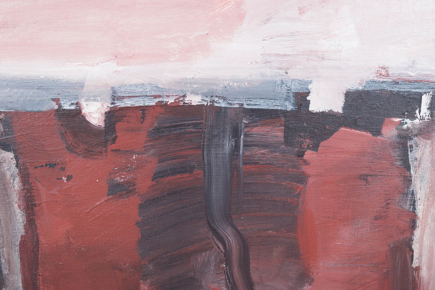 Abstrakt komposition udført i olie på plade med ekspressiv penselføring og lagdelte farvefelter i dæmpede rødlige og grå toner. Kompositionen fremstår med en balanceret spænding mellem struktur og spontanitet, signeret.
