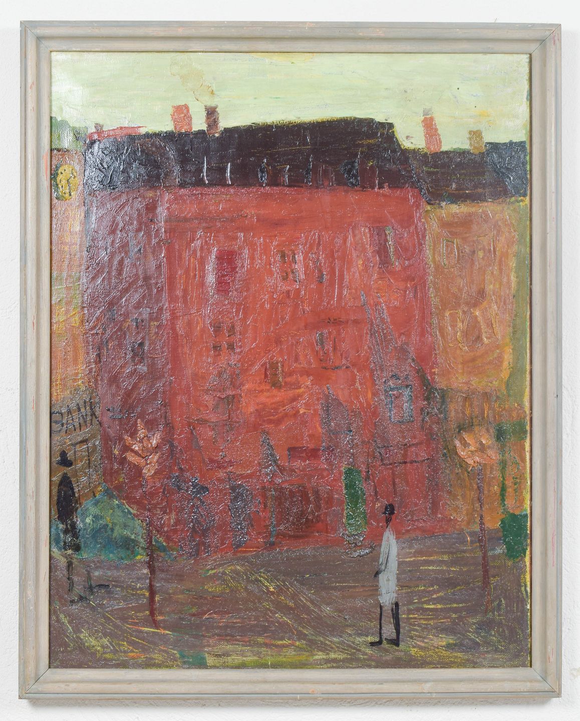 Bymotiv fra København med arkitektoniske facader og figurer gengivet i et modernistisk formsprog med afdæmpede farver og stoflig penselføring.