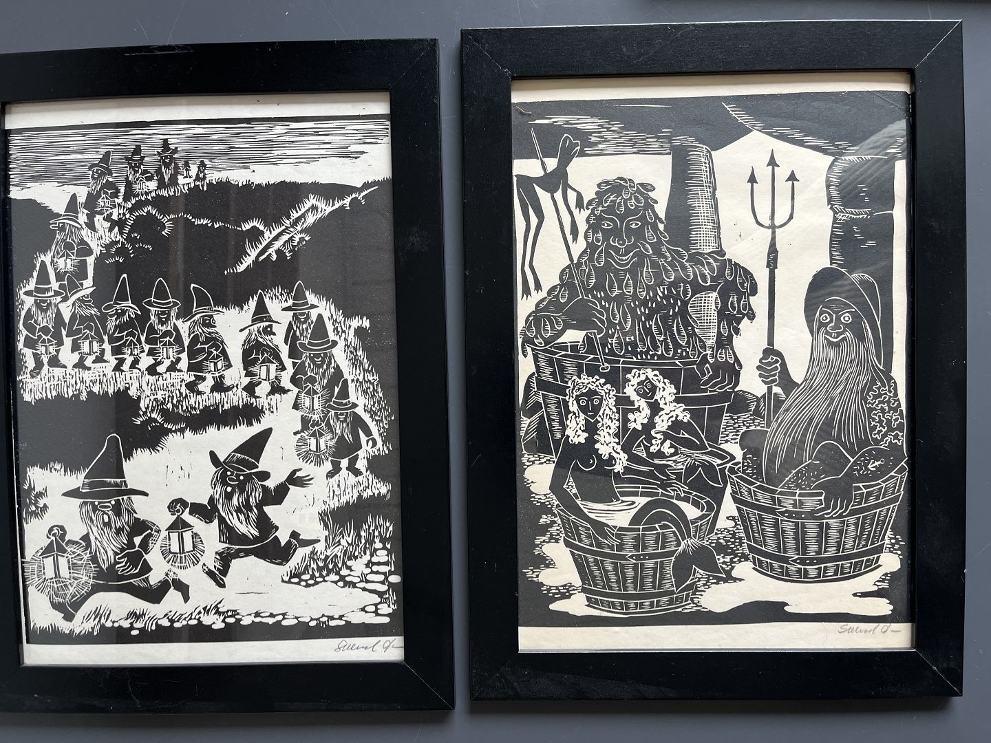 2 linoleumssnit af Svend P. Jørensen 1973.