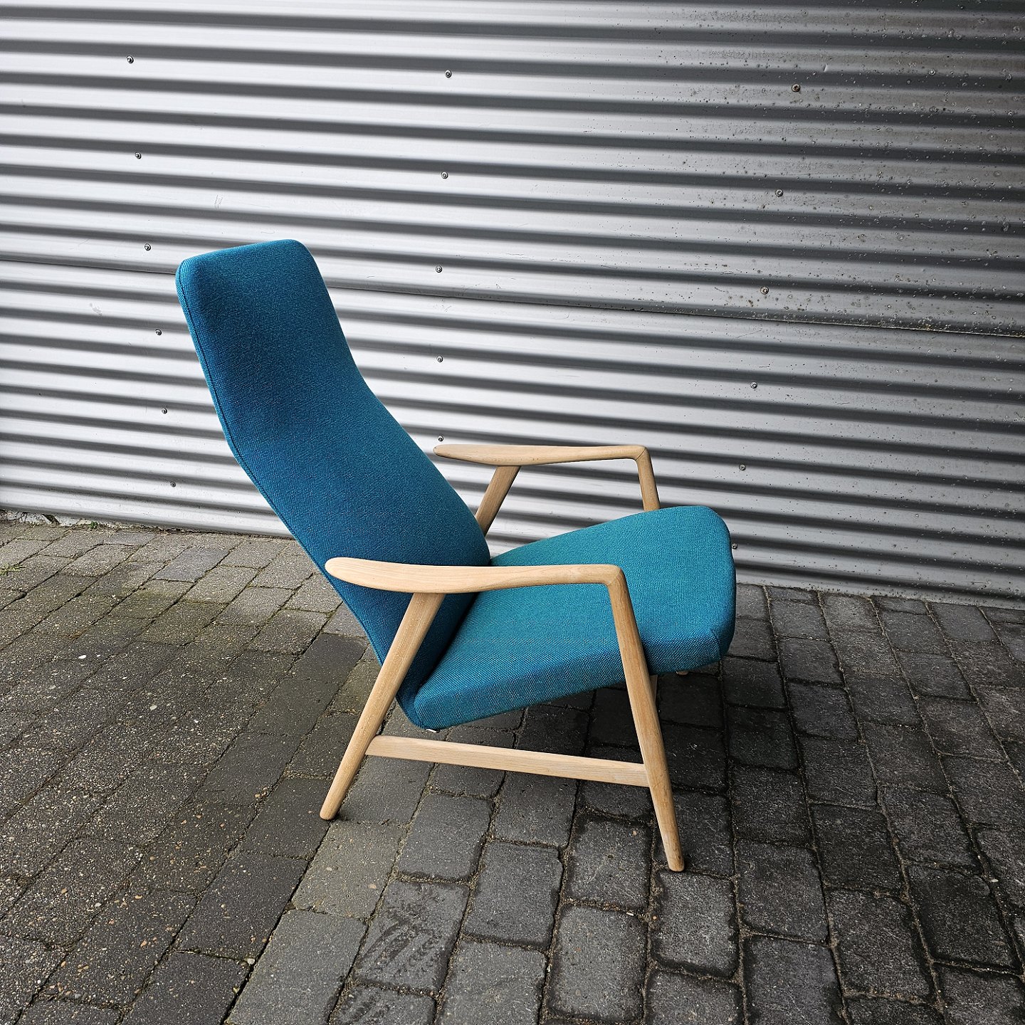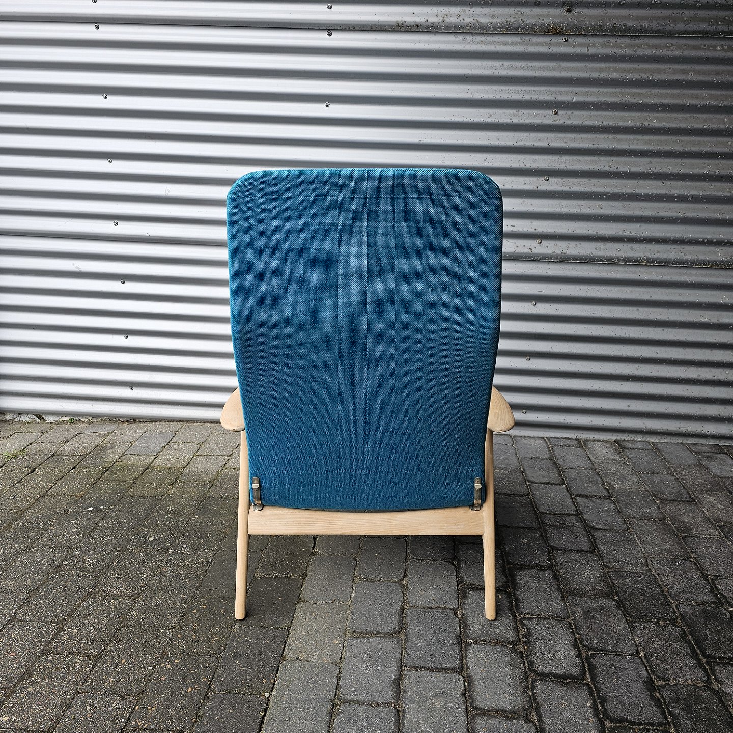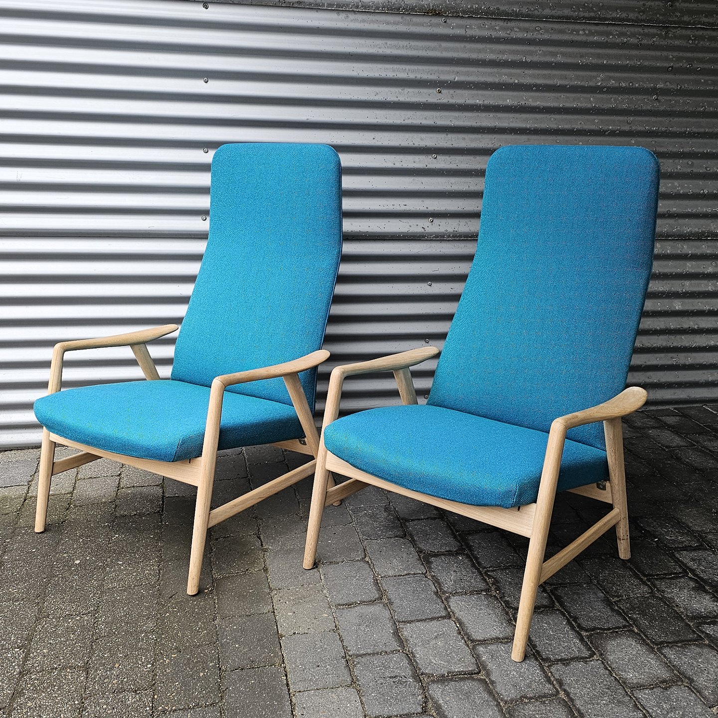 Sæt af to lænestole med træstel og sæde betrukket i blå Hallingdal uld