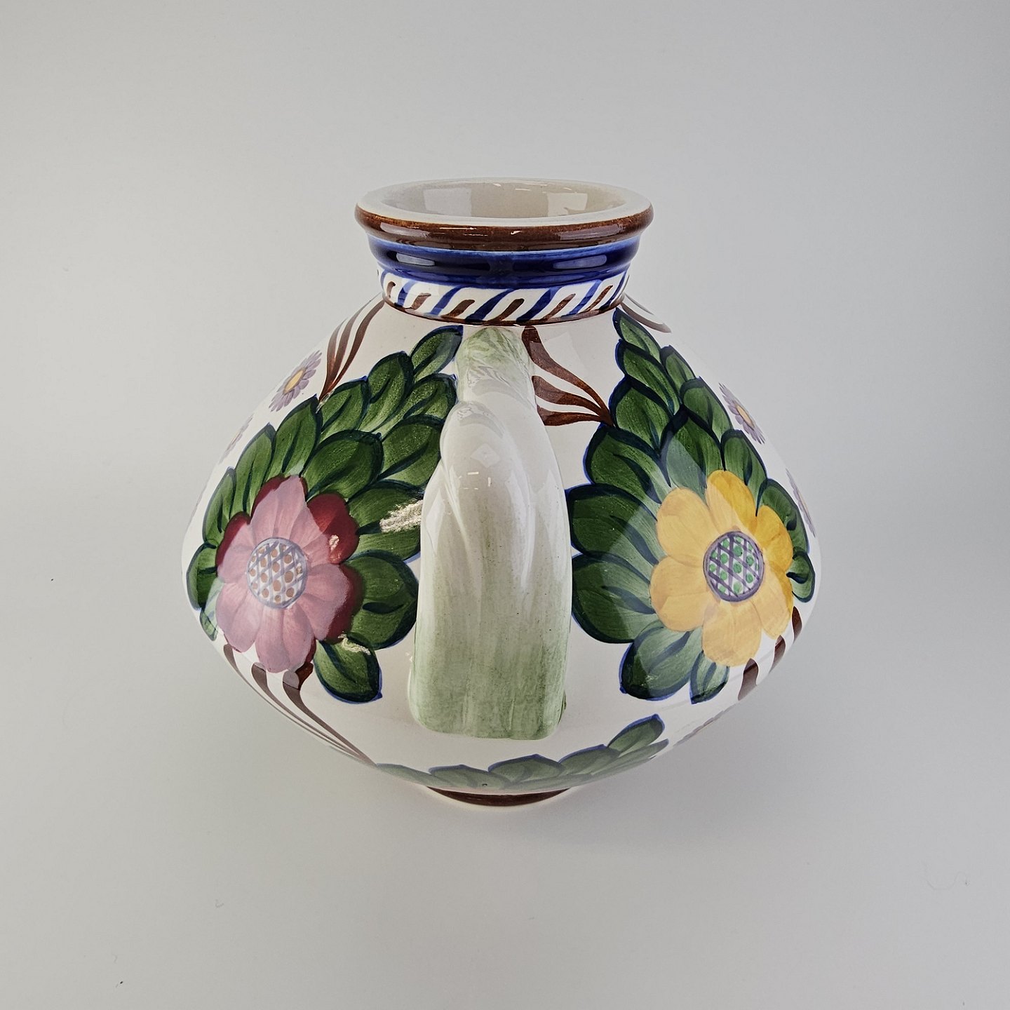 Vase med to hanke i fajance dekoreret med farverigt blomstermotiv