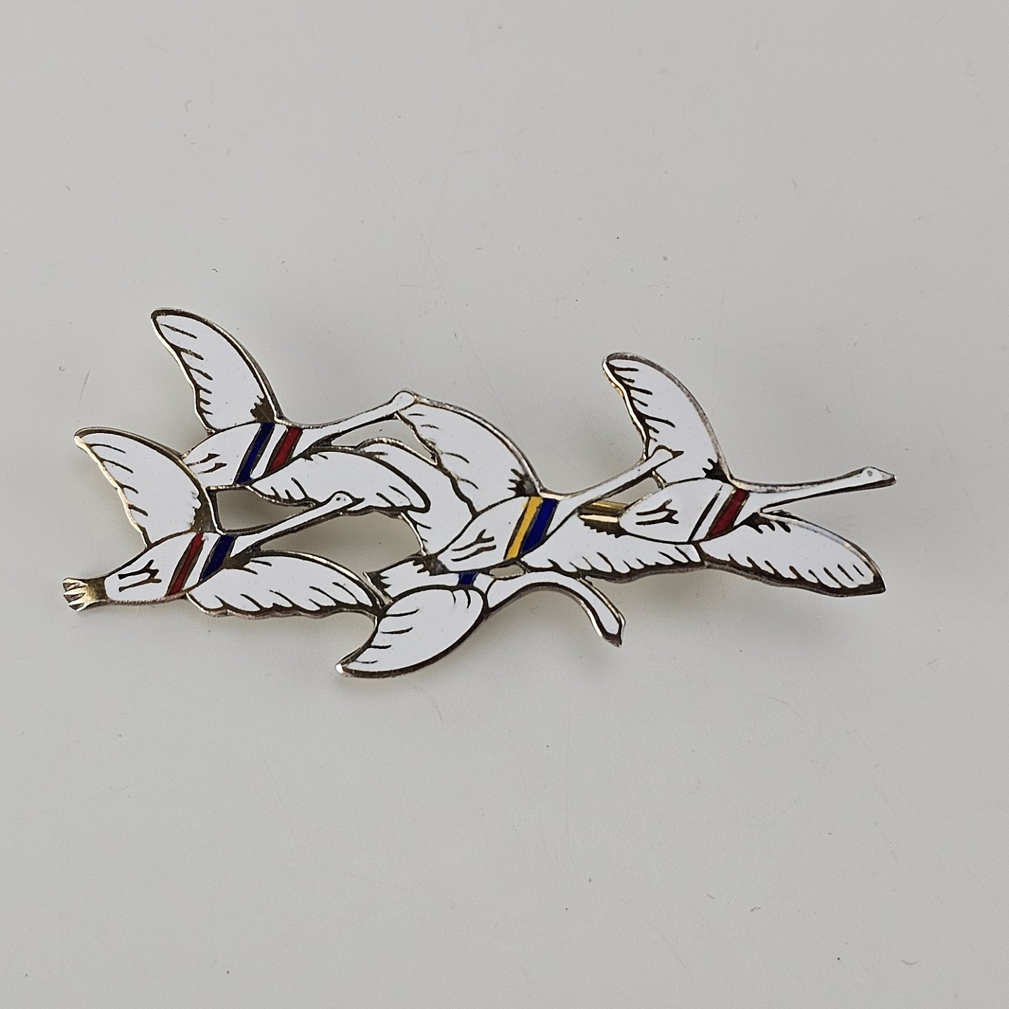 Broche i sterling sølv og emalje med motiv af fem svaner dekoreret med farver for de fem nordiske lande