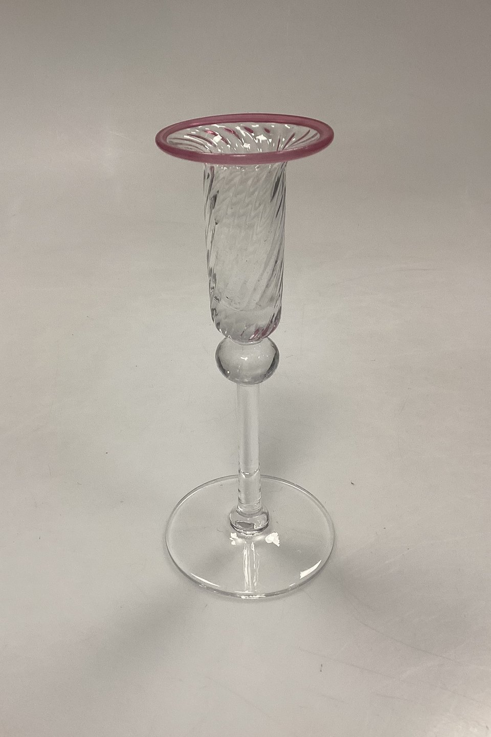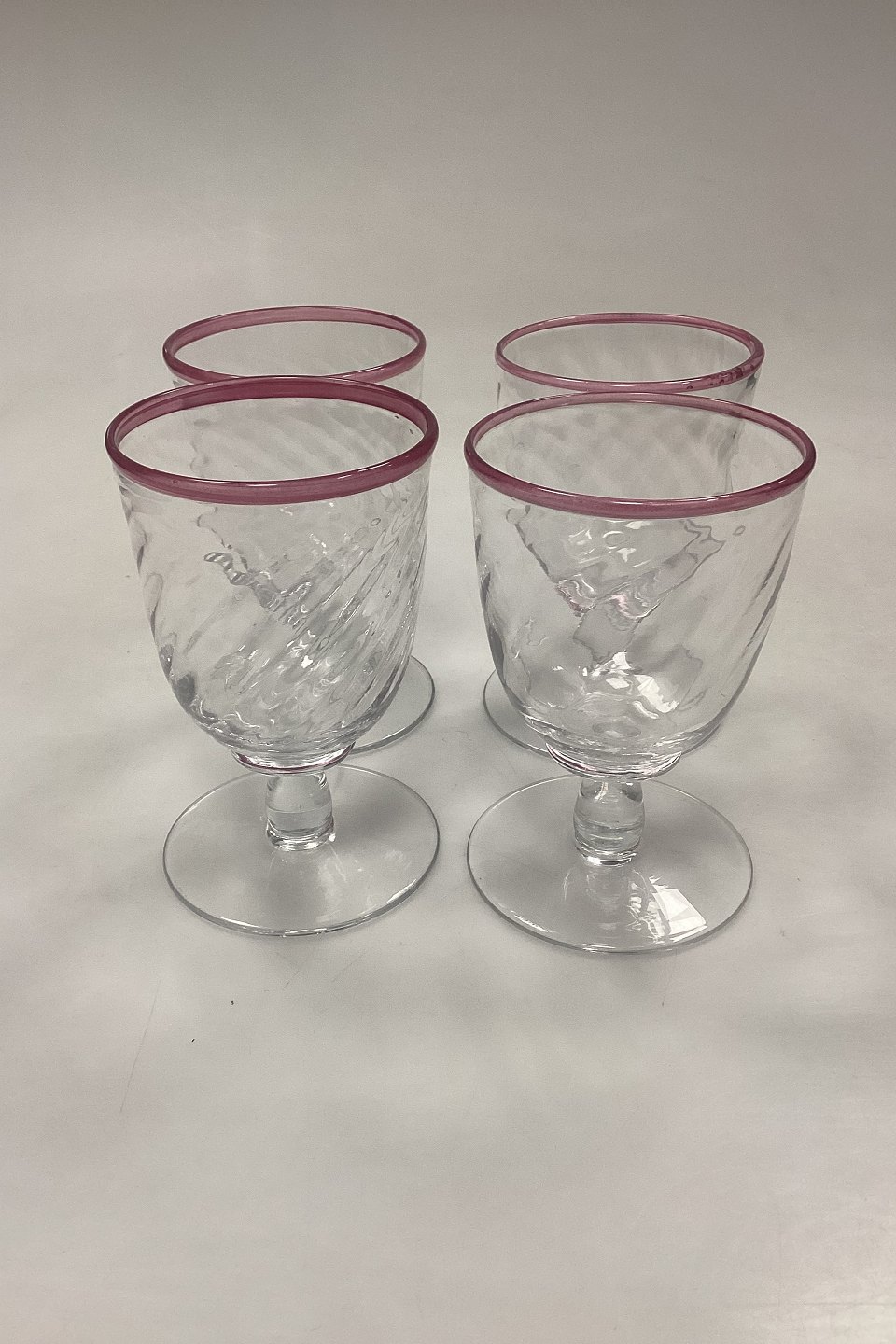 Large set of handmade glasses of 24 pieces. Clear glass with twisted optics and pink rim.