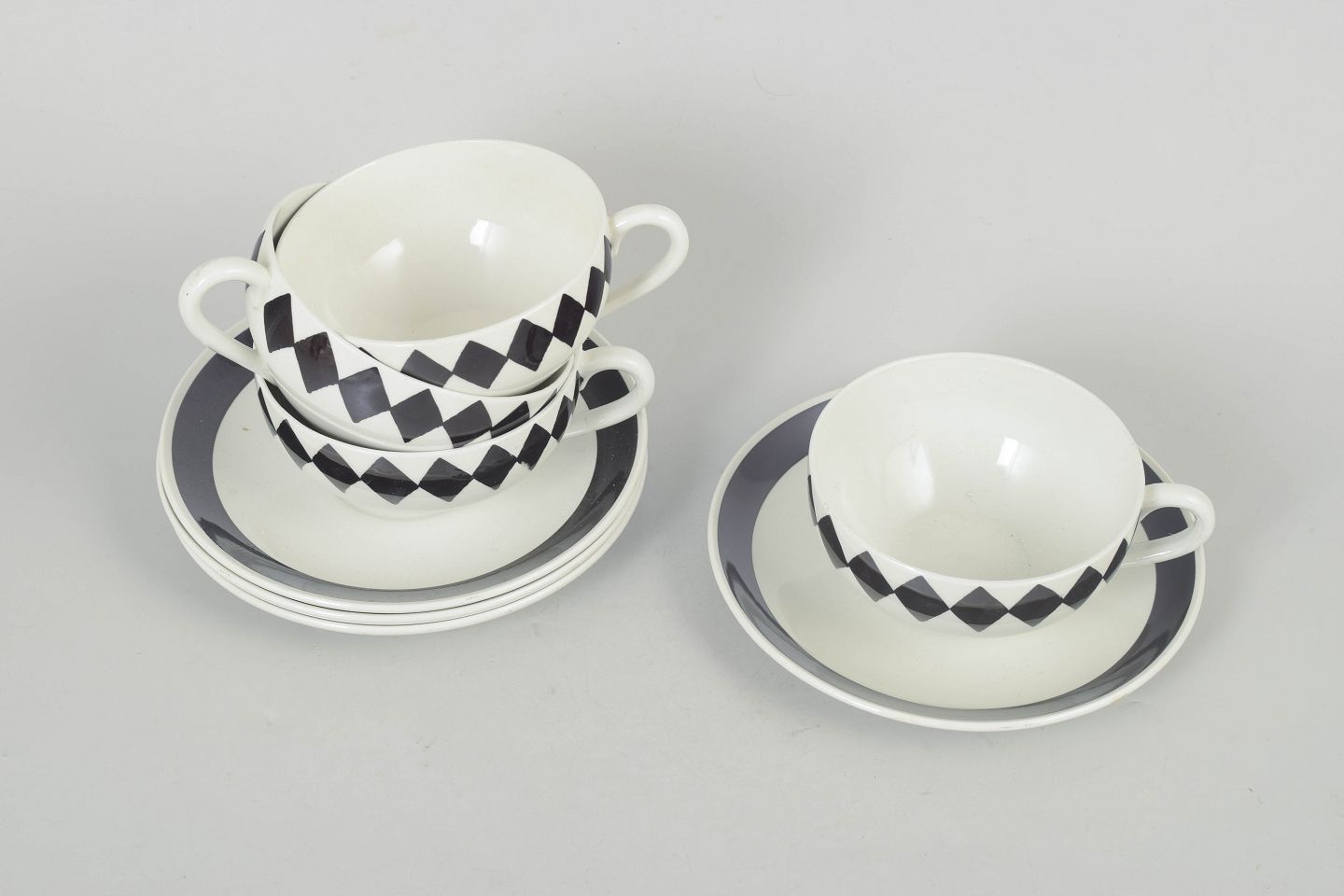 Sæt bestående af fire tekopper med tilhørende underkopper i porcelæn med karakteristisk sort rudemønster, udført i et enkelt og funktionelt formsprog fra perioden.