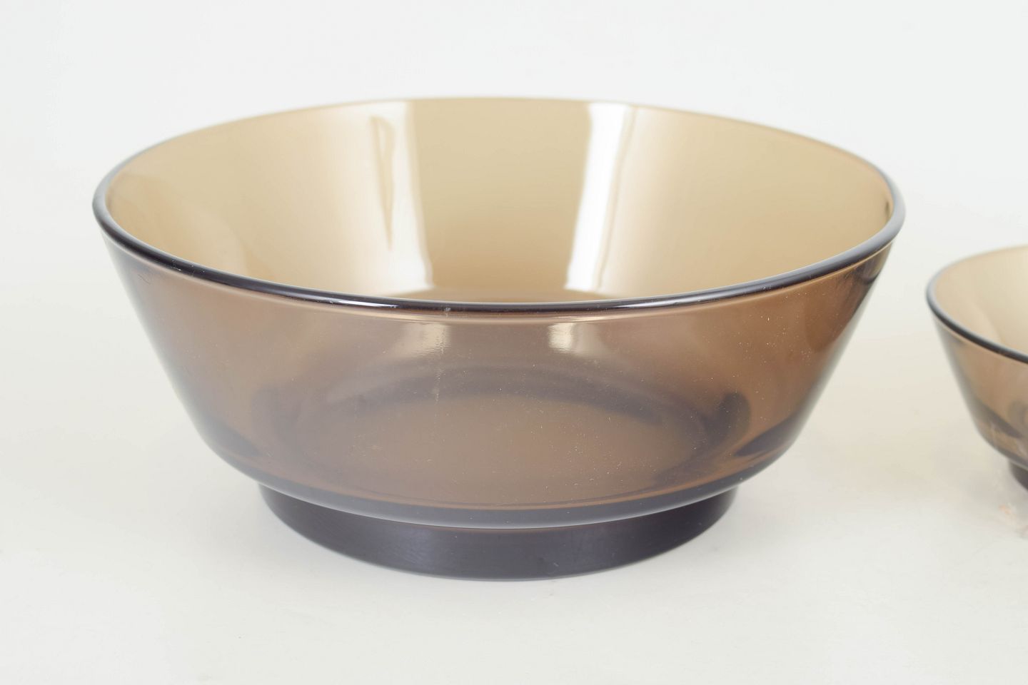 Sæt bestående af to små og én stor skål i presset glas med let konisk form og røgfarvet toning, fremstillet i Frankrig og mærket fra producenten.