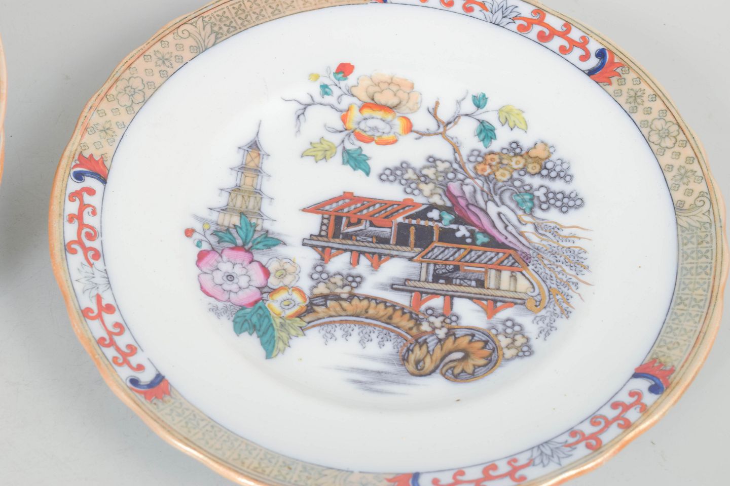 Dekorative tallerkener i fajance med polykrom dekoration i orientalistisk japansk stil med pagodemotiv, bygninger, fugl og blomster. Model Japan, produceret i perioden 1866–1925 og dateret til 1880’erne.