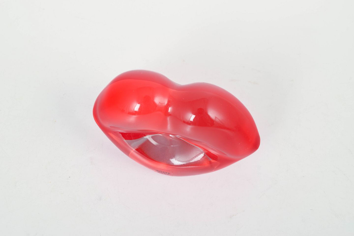 Skulpturel form som læber udført i massivt rødt glas med bløde organiske linjer og transparent effekt.