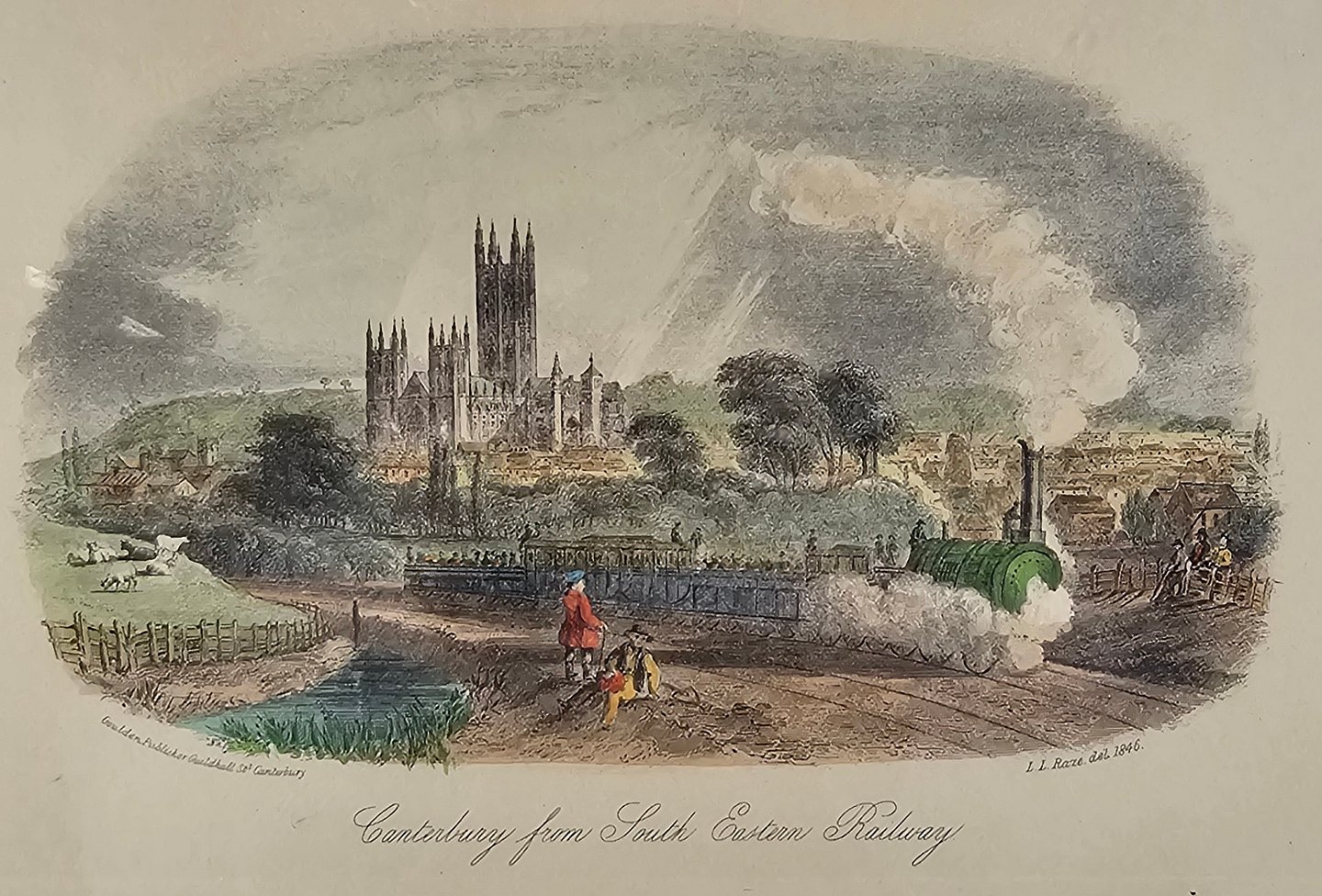 Bogryk på papir med motiv af Canterbury by fra den sydøstlige jernbane, monteret i sort ramme