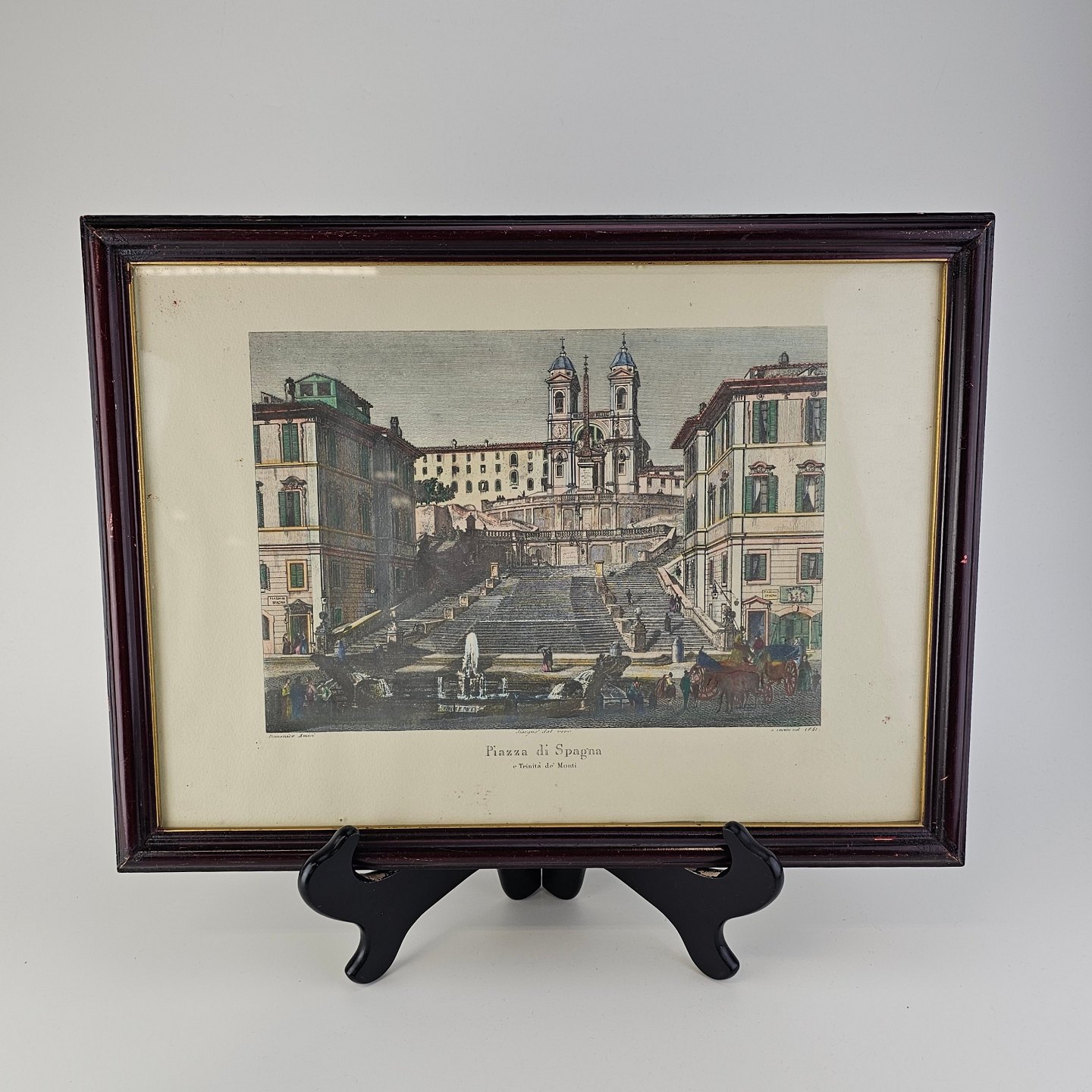 Bogtryk på papir med motiv af Piazza di Spagna i Rom, monteret i sort ramme
