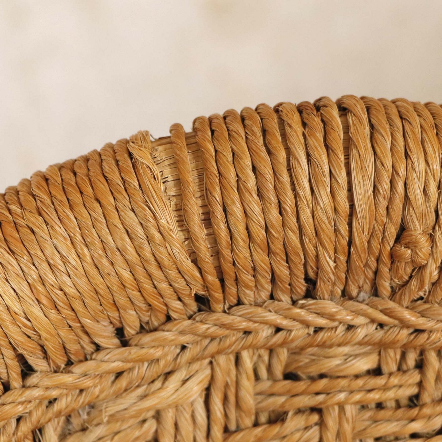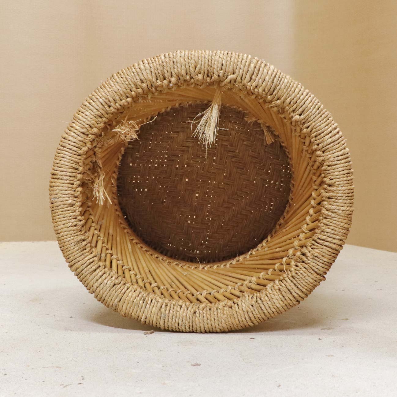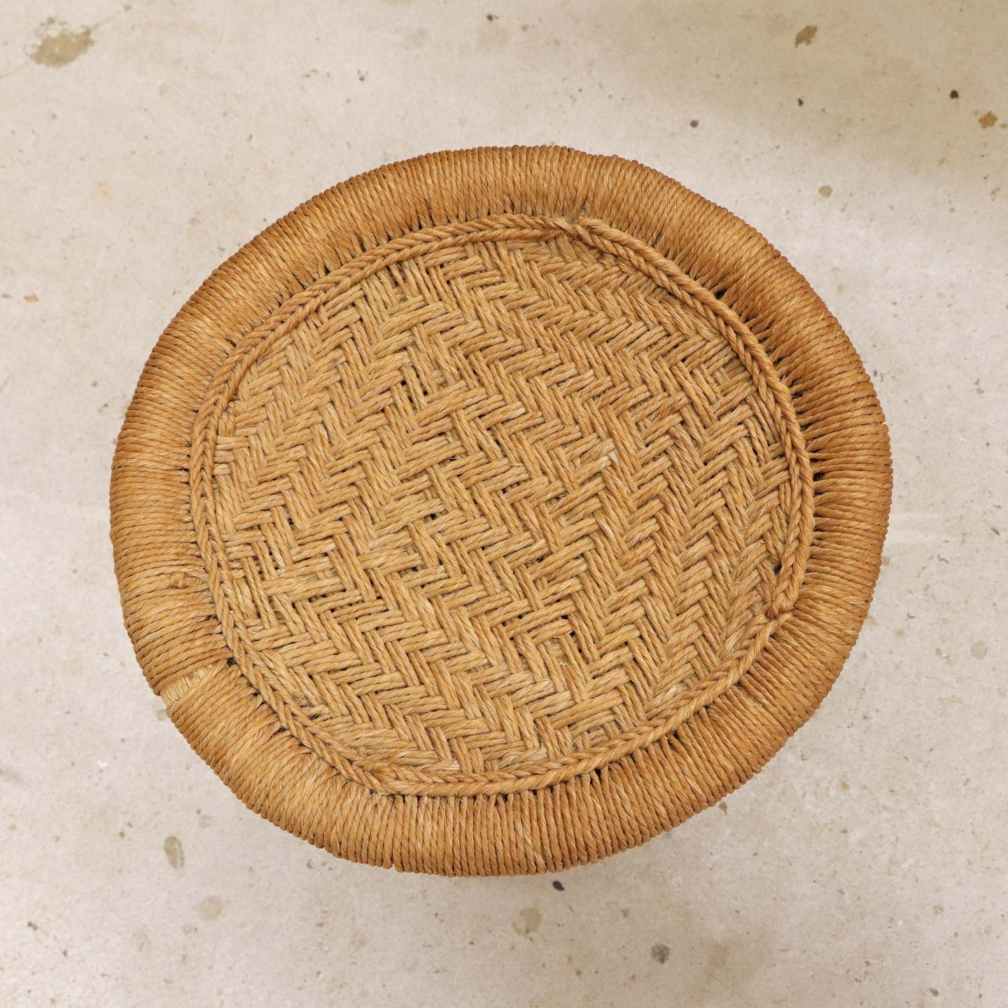 Mindre rund skammel med stel i bambus og sæde i flettet rattan.