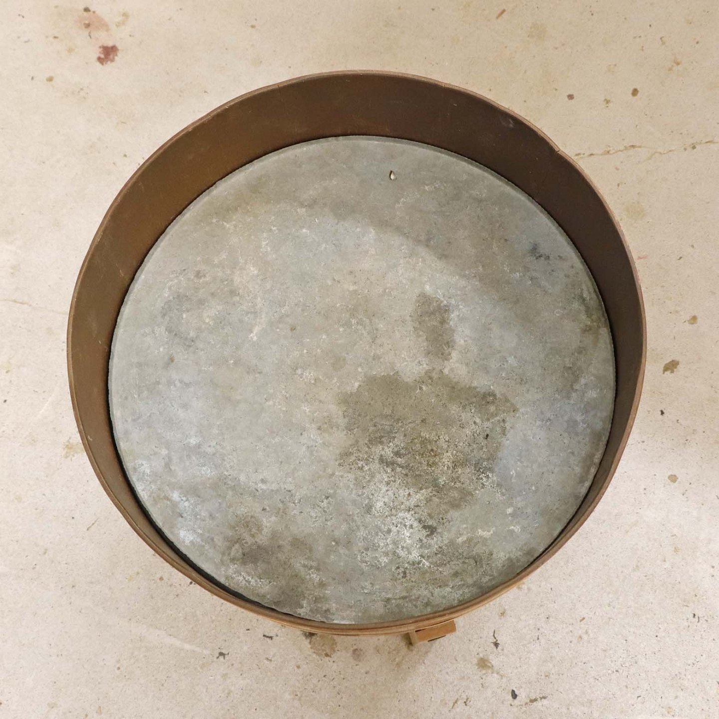 Tøndeformet kumme til blomster med stel i lakeret bøgetræ og ramme i teaktræ med gyldne dekoraktionsbånd og aftagelig bundplade i zink.