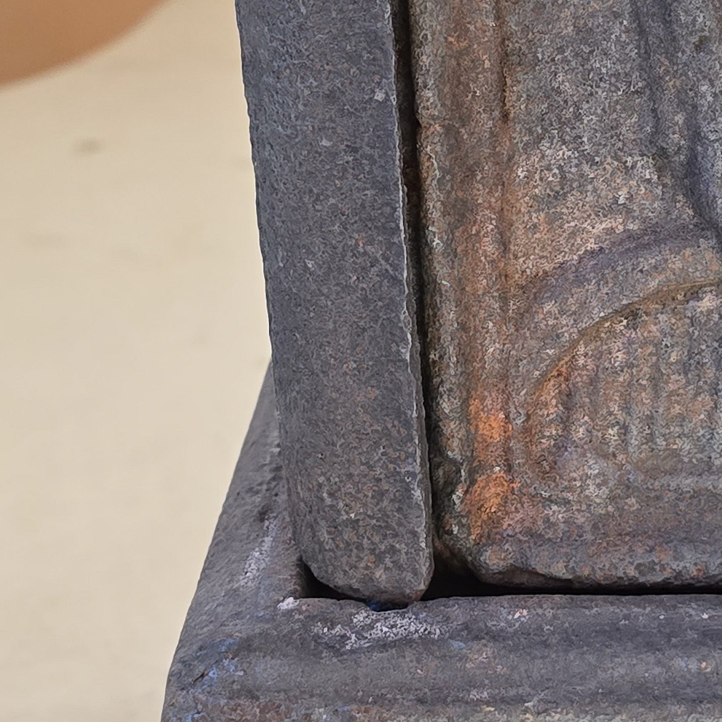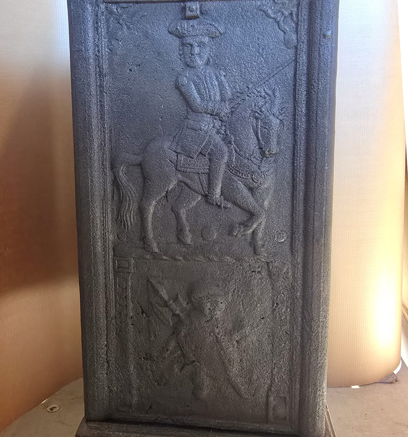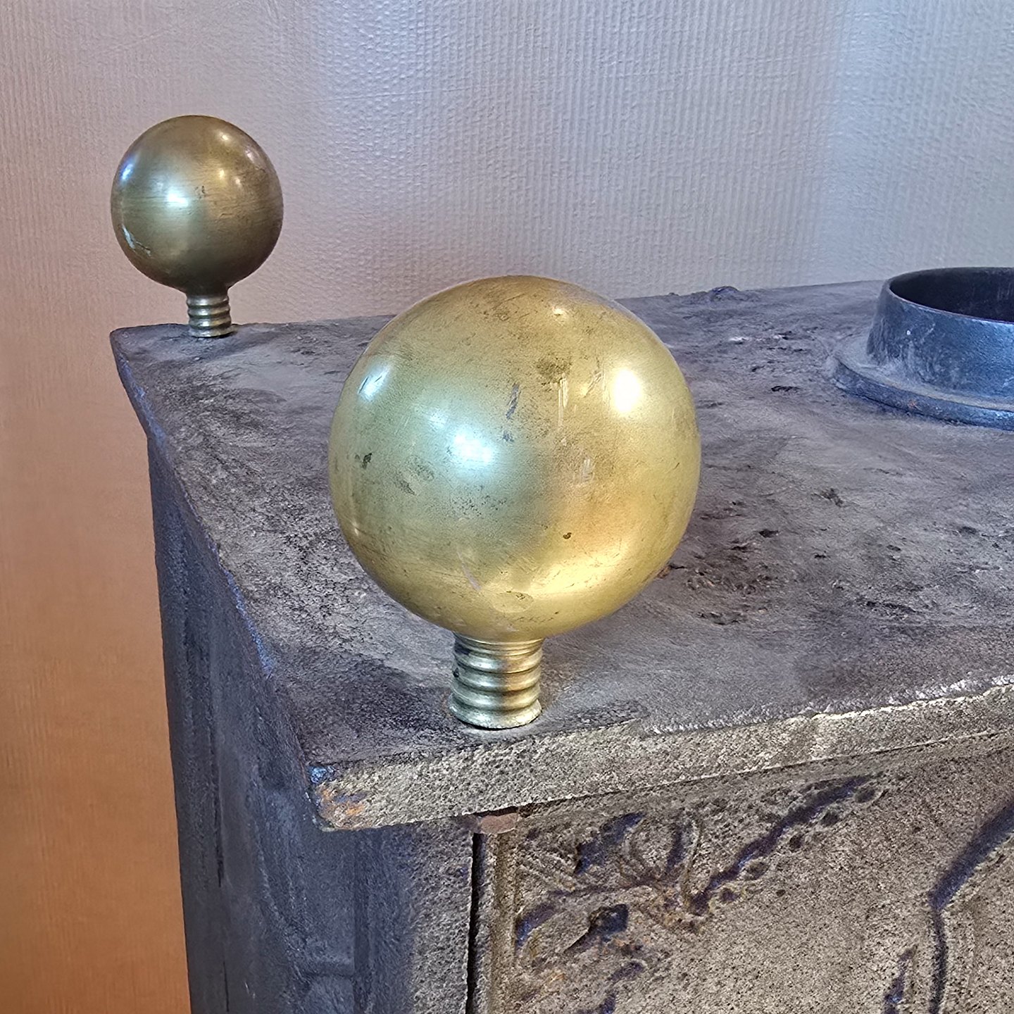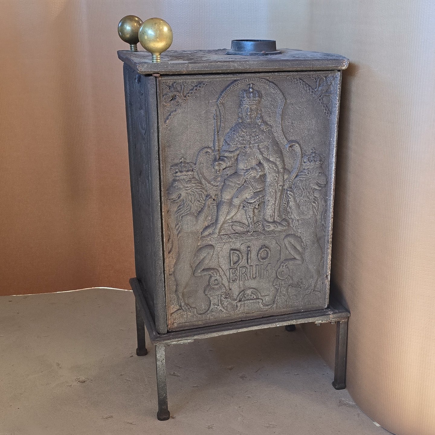 Antik svensk bilæggerovn i støbejern fremstillet i perioden år 1750-1800. Ovnen er dekoreret med motiv af den svenske konge siddende på tronen omgivet af to løver samt den svenske konge til hest. Ovnen har monteret to kugler i messing på toppladen.